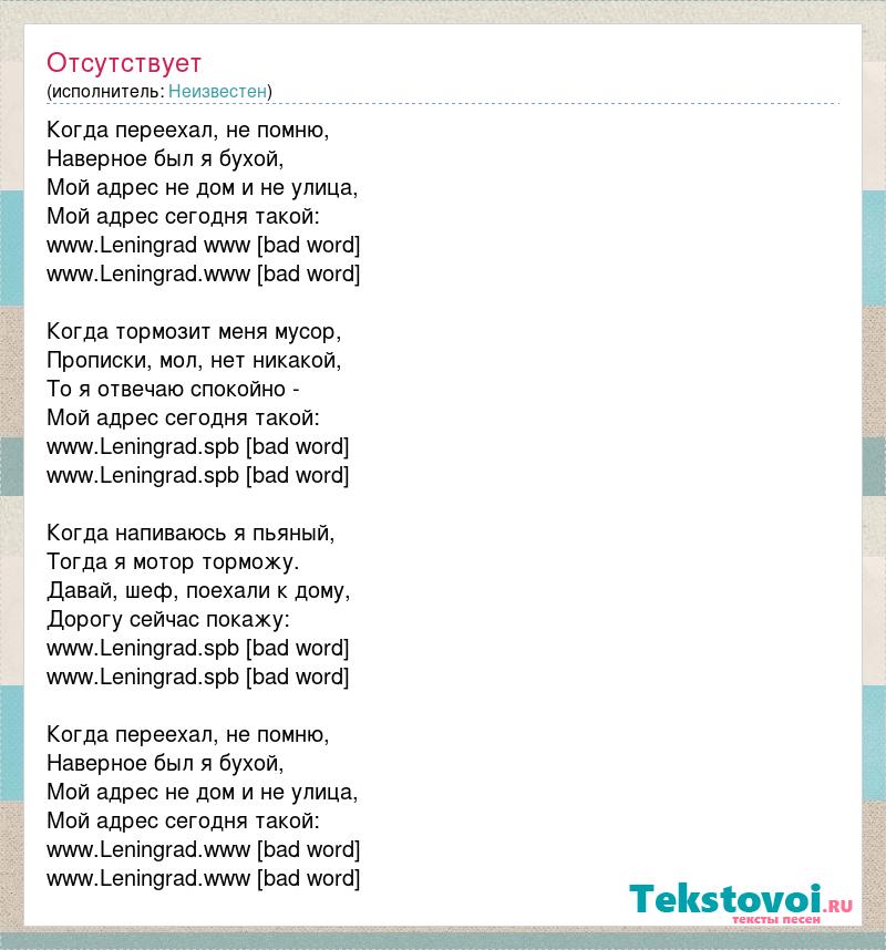 Когда переехал, не помню, Наверное был я бухой, Мой адрес не дом и не улица, Мой адрес сегодня такой: www.Leningrad www точка ru www.Leningrad.www точка ru Когда тормозит меня мусор, Прописки, мол, нет никакой, То я отвечаю спокойно - Мой адрес сегодня такой: www.Leningrad.spb точка ru www.Leningrad.spb точка ru Когда напиваюсь я пьяный, Тогда я мотор торможу. Давай, шеф, поехали к дому, Дорогу сейчас покажу: www.Leningrad.spb точка ru www.Leningrad.spb точка ru Когда переехал, не помню, Наверное был я бухой, Мой адрес не дом и не улица, Мой адрес сегодня такой: www.Leningrad.www точка ru www.Leningrad.www точка ru