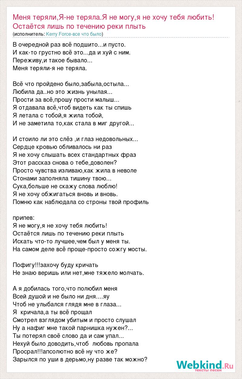 В очередной раз всё подшито...и пусто. И как-то грустно всё это...да и хуй с ним. Переживу,и такое бывало... Меня теряли-я не теряла. Всё что пройдено было,забыла,остыла... Любила да..но это жизнь унылая... Прости за всё,прошу прости малыш... Я отдавала всё,чтоб видеть как ты спишь Я летала с тобой,я жила тобой, И не заметила то,как стала в миг другой... И стоило ли это слёз ,и глаз недовольных... Сердце кровью обливалось ни раз Я не хочу слышать всех стандартных фраз Этот рассказ снова о тебе,доволен? Просто чувства изливаю,как жила в неволе Стонами заполняла тишину твою... Сука,больше не скажу слова люблю! Я не хочу обжигаться вновь и вновь. Помню как наблюдала со строны твой профиль припев: Я не могу,я не хочу тебя любить! Остаётся лишь по течению реки плыть Искать что-то лучшее,чем был у меня ты. На самом деле всё проще-просто сожгу мосты. Пофигу!!!захочу буду кричать Не знаю веришь или нет,мне тяжело молчать. А я добилась того,что полюбил меня Всей душой и не было ни дня....яу Чтоб не улыбался глядя мне в глаза... Я кричала,а ты всё прощал Смотрел взглядом убитым и просто слушал Ну а нафиг мне такой парнишка нужен?... Ты потерял своё слово да и сам упал... Нехуй было доводить,чтоб любовь пропала Просрал!!!апсолютно всё ну что же? Зарылся по уши в дерьмо,ну разве так можно?