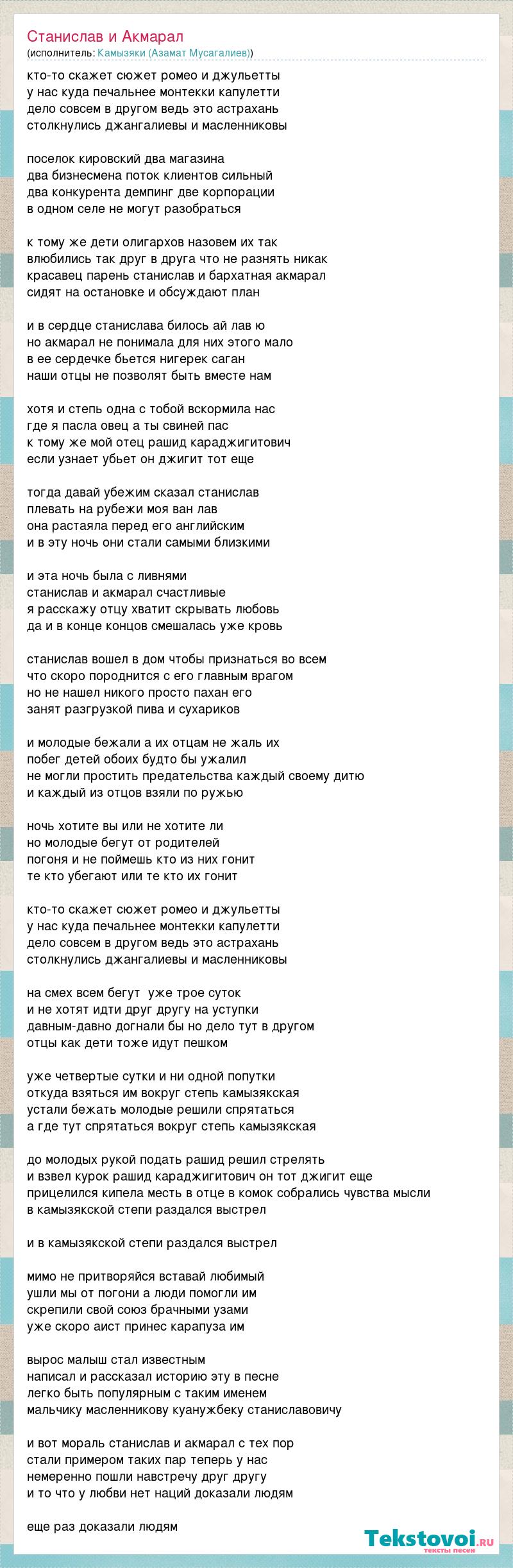 кто-то скажет сюжет ромео и джульетты у нас куда печальнее монтекки капулетти дело совсем в другом ведь это астрахань столкнулись джангалиевы и масленниковы поселок кировский два магазина два бизнесмена поток клиентов сильный два конкурента демпинг две корпорации в одном селе не могут разобраться к тому же дети олигархов назовем их так влюбились так друг в друга что не разнять никак красавец парень станислав и бархатная акмарал сидят на остановке и обсуждают план и в сердце станислава билось ай лав ю но акмарал не понимала для них этого мало в ее сердечке бьется нигерек саган наши отцы не позволят быть вместе нам хотя и степь одна с тобой вскормила нас где я пасла овец а ты свиней пас к тому же мой отец рашид караджигитович если узнает убьет он джигит тот еще тогда давай убежим сказал станислав плевать на рубежи моя ван лав она растаяла перед его английским и в эту ночь они стали самыми близкими и эта ночь была с ливнями станислав и акмарал счастливые я расскажу отцу хватит скрывать любовь да и в конце концов смешалась уже кровь станислав вошел в дом чтобы признаться во всем что скоро породнится с его главным врагом но не нашел никого просто пахан его занят разгрузкой пива и сухариков и молодые бежали а их отцам не жаль их побег детей обоих будто бы ужалил не могли простить предательства каждый своему дитю и каждый из отцов взяли по ружью ночь хотите вы или не хотите ли но молодые бегут от родителей погоня и не поймешь кто из них гонит те кто убегают или те кто их гонит кто-то скажет сюжет ромео и джульетты у нас куда печальнее монтекки капулетти дело совсем в другом ведь это астрахань столкнулись джангалиевы и масленниковы на смех всем бегут уже трое суток и не хотят идти друг другу на уступки давным-давно догнали бы но дело тут в другом отцы как дети тоже идут пешком уже четвертые сутки и ни одной попутки откуда взяться им вокруг степь камызякская устали бежать молодые решили спрятаться а где тут спрятаться вокруг степь камызякская до молодых рукой подать рашид решил стрелять и взвел курок рашид караджигитович он тот джигит еще прицелился кипела месть в отце в комок собрались чувства мысли в камызякской степи раздался выстрел и в камызякской степи раздался выстрел мимо не притворяйся вставай любимый ушли мы от погони а люди помогли им скрепили свой союз брачными узами уже скоро аист принес карапуза им вырос малыш стал известным написал и рассказал историю эту в песне легко быть популярным с таким именем мальчику масленникову куанужбеку станиславовичу и вот мораль станислав и акмарал с тех пор стали примером таких пар теперь у нас немеренно пошли навстречу друг другу и то что у любви нет наций доказали людям еще раз доказали людям