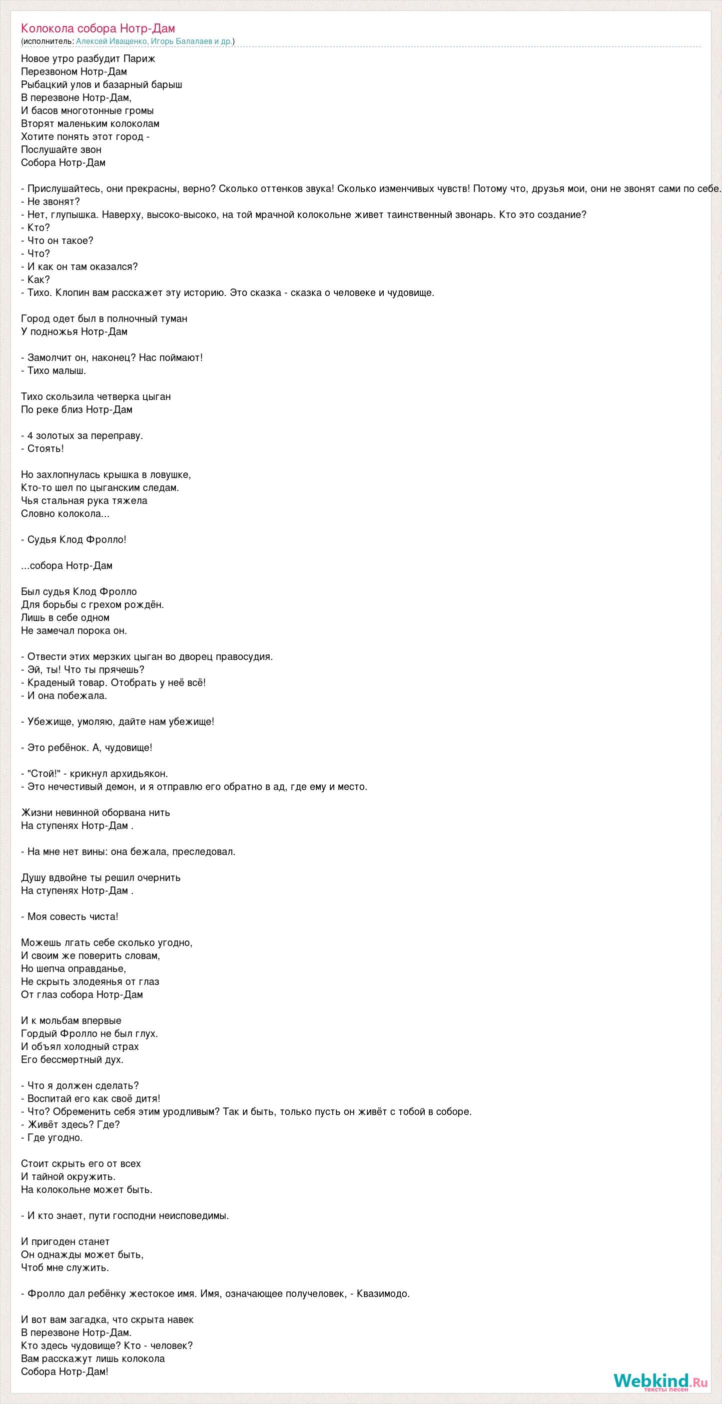 Новое утро разбудит Париж Перезвоном Нотр-Дам Рыбацкий улов и базарный барыш В перезвоне Нотр-Дам, И басов многотонные громы Вторят маленьким колоколам Хотите понять этот город - Послушайте звон Собора Нотр-Дам - Прислушайтесь, они прекрасны, верно? Сколько оттенков звука! Сколько изменчивых чувств! Потому что, друзья мои, они не звонят сами по себе. - Не звонят? - Нет, глупышка. Наверху, высоко-высоко, на той мрачной колокольне живет таинственный звонарь. Кто это создание? - Кто? - Что он такое? - Что? - И как он там оказался? - Как? - Тихо. Клопин вам расскажет эту историю. Это сказка - сказка о человеке и чудовище. Город одет был в полночный туман У подножья Нотр-Дам - Замолчит он, наконец? Нас поймают! - Тихо малыш. Тихо скользила четверка цыган По реке близ Нотр-Дам - 4 золотых за переправу. - Стоять! Но захлопнулась крышка в ловушке, Кто-то шел по цыганским следам. Чья стальная рука тяжела Словно колокола... - Судья Клод Фролло! ...собора Нотр-Дам Был судья Клод Фролло Для борьбы с грехом рождён. Лишь в себе одном Не замечал порока он. - Отвести этих мерзких цыган во дворец правосудия. - Эй, ты! Что ты прячешь? - Краденый товар. Отобрать у неё всё! - И она побежала. - Убежище, умоляю, дайте нам убежище! - Это ребёнок. А, чудовище! - "Стой!" - крикнул архидьякон. - Это нечестивый демон, и я отправлю его обратно в ад, где ему и место. Жизни невинной оборвана нить На ступенях Нотр-Дам . - На мне нет вины: она бежала, преследовал. Душу вдвойне ты решил очернить На ступенях Нотр-Дам . - Моя совесть чиста! Можешь лгать себе сколько угодно, И своим же поверить словам, Но шепча оправданье, Не скрыть злодеянья от глаз От глаз собора Нотр-Дам И к мольбам впервые Гордый Фролло не был глух. И объял холодный страх Его бессмертный дух. - Что я должен сделать? - Воспитай его как своё дитя! - Что? Обременить себя этим уродливым? Так и быть, только пусть он живёт с тобой в соборе. - Живёт здесь? Где? - Где угодно. Стоит скрыть его от всех И тайной окружить. На колокольне может быть. - И кто знает, пути господни неисповедимы. И пригоден станет Он однажды может быть, Чтоб мне служить. - Фролло дал ребёнку жестокое имя. Имя, означающее получеловек, - Квазимодо. И вот вам загадка, что скрыта навек В перезвоне Нотр-Дам. Кто здесь чудовище? Кто - человек? Вам расскажут лишь колокола Собора Нотр-Дам!