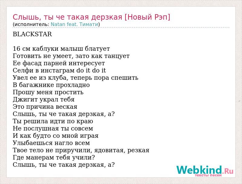 BLACKSTAR 16 см каблуки малыш блатует Готовить не умеет, зато как танцует Ее фасад парней интересует Селфи в инстаграм do it do it Увел ее из клуба, теперь пора спешить В багажнике прохладно Прошу меня простить Джигит украл тебя Это причина веская Слышь, ты че такая дерзкая, а? Ты решила идти по краю Не послушная ты совсем И как будто со мной играя Улыбаешься нагло всем Твое тело не приручили, ядовитая, резкая Где манерам тебя учили? Слышь, ты че такая дерзкая, а?