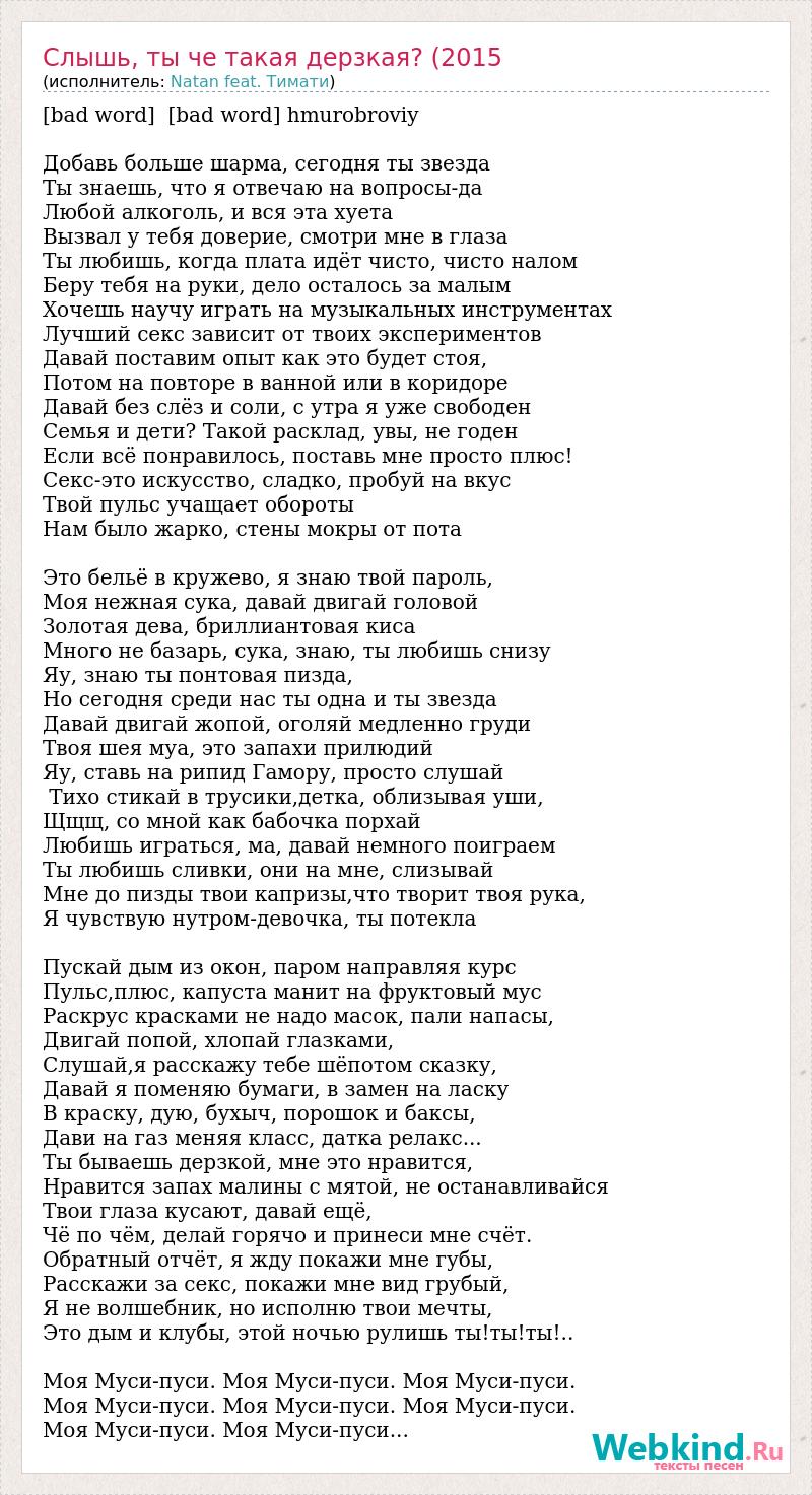 [bad word] [bad word] hmurobroviy Добавь больше шарма, сегодня ты звезда Ты знаешь, что я отвечаю на вопросы-да Любой алкоголь, и вся эта хуета Вызвал у тебя доверие, смотри мне в глаза Ты любишь, когда плата идёт чисто, чисто налом Беру тебя на руки, дело осталось за малым Хочешь научу играть на музыкальных инструментах Лучший секс зависит от твоих экспериментов Давай поставим опыт как это будет стоя, Потом на повторе в ванной или в коридоре Давай без слёз и соли, с утра я уже свободен Семья и дети? Такой расклад, увы, не годен Если всё понравилось, поставь мне просто плюс! Секс-это искусство, сладко, пробуй на вкус Твой пульс учащает обороты Нам было жарко, стены мокры от пота Это бельё в кружево, я знаю твой пароль, Моя нежная сука, давай двигай головой Золотая дева, бриллиантовая киса Много не базарь, сука, знаю, ты любишь снизу Яу, знаю ты понтовая пизда, Но сегодня среди нас ты одна и ты звезда Давай двигай жопой, оголяй медленно груди Твоя шея муа, это запахи прилюдий Яу, ставь на рипид Гамору, просто слушай Тихо стикай в трусики,детка, облизывая уши, Щщщ, со мной как бабочка порхай Любишь играться, ма, давай немного поиграем Ты любишь сливки, они на мне, слизывай Мне до пизды твои капризы,что творит твоя рука, Я чувствую нутром-девочка, ты потекла Пускай дым из окон, паром направляя курс Пульс,плюс, капуста манит на фруктовый мус Раскрус красками не надо масок, пали напасы, Двигай попой, хлопай глазками, Слушай,я расскажу тебе шёпотом сказку, Давай я поменяю бумаги, в замен на ласку В краску, дую, бухыч, порошок и баксы, Дави на газ меняя класс, датка релакс... Ты бываешь дерзкой, мне это нравится, Нравится запах малины с мятой, не останавливайся Твои глаза кусают, давай ещё, Чё по чём, делай горячо и принеси мне счёт. Обратный отчёт, я жду покажи мне губы, Расскажи за секс, покажи мне вид грубый, Я не волшебник, но исполню твои мечты, Это дым и клубы, этой ночью рулишь ты!ты!ты!.. Моя Муси-пуси. Моя Муси-пуси. Моя Муси-пуси. Моя Муси-пуси. Моя Муси-пуси. Моя Муси-пуси. Моя Муси-пуси. Моя Муси-пуси...