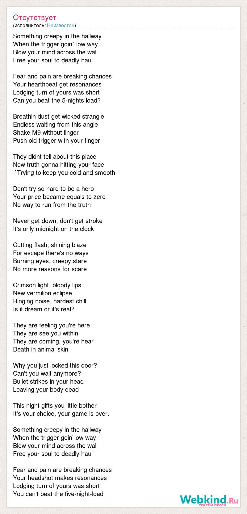 Something creepy in the hallway When the trigger goin` low way Blow your mind across the wall Free your soul to deadly haul Fear and pain are breaking chances Your hearthbeat get resonanсes Lodging turn of yours was short Can you beat the 5-nights load? Breathin dust get wicked strangle Endless waiting from this angle Shake M9 without linger Push old trigger with your finger They didnt tell about this place Now truth gonna hitting your face `Trying to keep you cold and smooth Don't try so hard to be a hero Your price became equals to zero No way to run from the truth Never get down, don't get stroke It's only midnight on the clock Сutting flash, shining blaze For escape there's no ways Burning eyes, creepy stare No more reasons for scare Crimson light, bloody lips New vermilion eclipse Ringing noise, hardest chill Is it dream or it's real? They are feeling you're here They are see you within They are coming, you're hear Death in animal skin Why you just locked this door? Can't you wait anymore? Bullet strikes in your head Leaving your body dead This night gifts you little bother It's your choice, your game is over. Something creepy in the hallway When the trigger goin`low way Blow your mind across the wall Free your soul to deadly haul Fear and pain are breaking chances Your headshot makes resonances Lodging turn of yours was short You can't beat the five-night-load