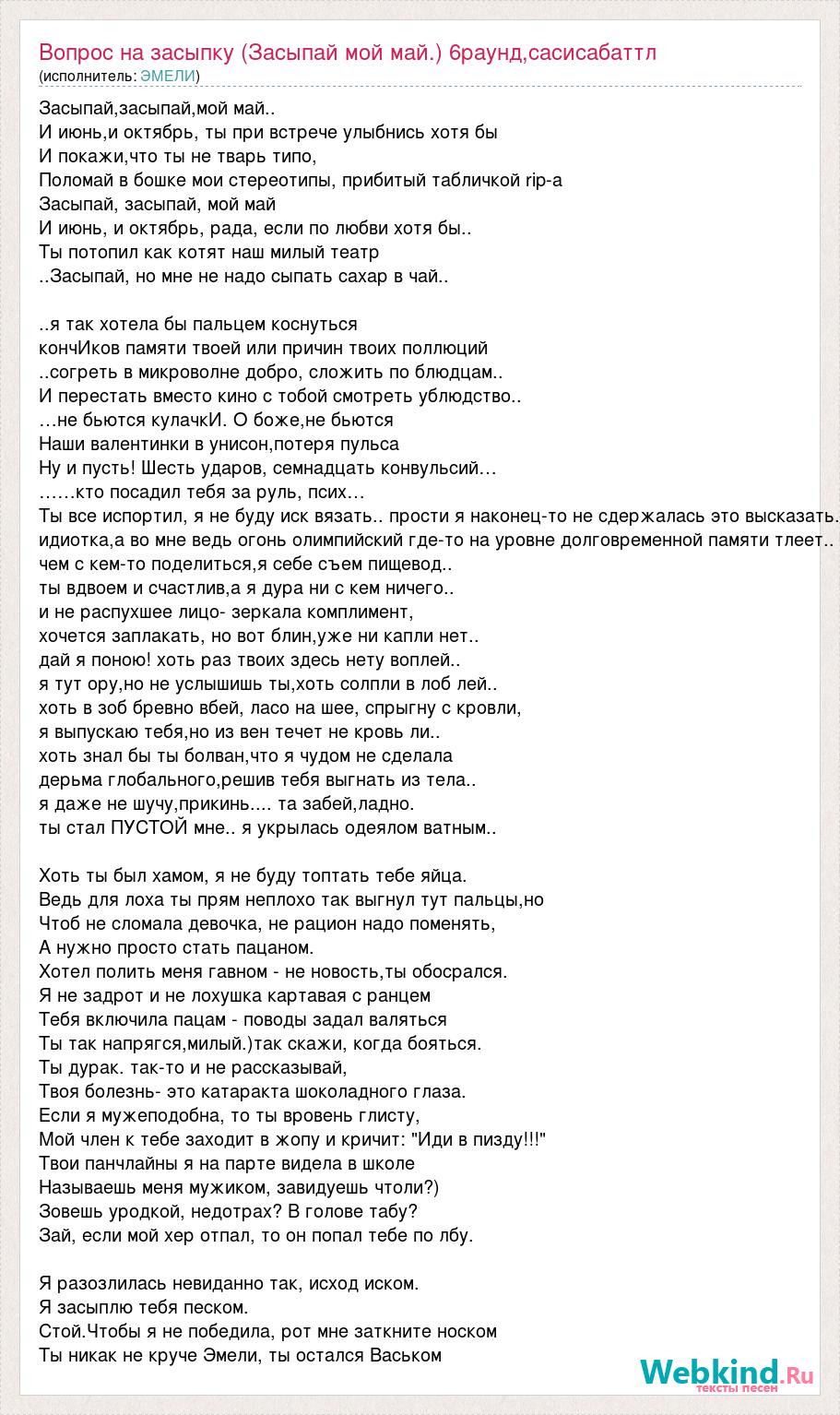 А как ты думаешь, о чем песня "Вопрос на засыпку (Засыпай мой май.) 6раунд,сасисабаттл" ?