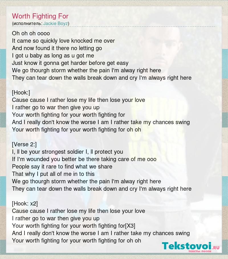 Oh oh oh oooo It came so quickly love knocked me over And now found it there no letting go I got u baby as long as u got me Just know it gonna get harder before get easy We go thourgh storm whether the pain I'm alway right here They can tear down the walls break down and cry I'm always right here [Hook:] Cause cause I rather lose my life then lose your love I rather go to war then give you up Your worth fighting for your worth fighting for And I really don't know the worse I am I rather take my chances swing Your worth fighting for your worth fighting for oh oh [Verse 2:] I, ll be your strongest soldier I, ll protect you If I'm wounded you better be there taking care of me ooo People say it rare to find what we share That why I put all of me in to this We go thourgh storm whether the pain I'm alway right here They can tear down the walls break down and cry I'm always right here [Hook: x2] Cause cause I rather lose my life then lose your love I rather go to war then give you up Your worth fighting for your worth fighting for[X3] And I really don't know the worse I am I rather take my chances swing Your worth fighting for your worth fighting for oh oh