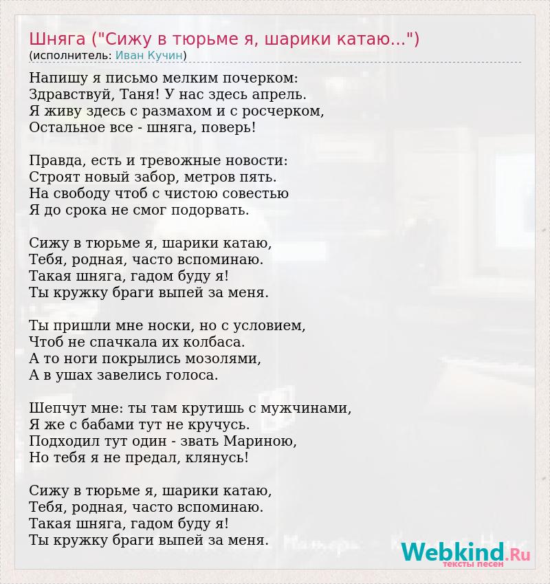 Напишу я письмо мелким почерком: Здравствуй, Таня! У нас здесь апрель. Я живу здесь с размахом и с росчерком, Остальное все - шняга, поверь! Правда, есть и тревожные новости: Строят новый забор, метров пять. На свободу чтоб с чистою совестью Я до срока не смог подорвать. Сижу в тюрьме я, шарики катаю, Тебя, родная, часто вспоминаю. Такая шняга, гадом буду я! Ты кружку браги выпей за меня. Ты пришли мне носки, но с условием, Чтоб не спачкала их колбаса. А то ноги покрылись мозолями, А в ушах завелись голоса. Шепчут мне: ты там крутишь с мужчинами, Я же с бабами тут не кручусь. Подходил тут один - звать Мариною, Но тебя я не предал, клянусь! Сижу в тюрьме я, шарики катаю, Тебя, родная, часто вспоминаю. Такая шняга, гадом буду я! Ты кружку браги выпей за меня.