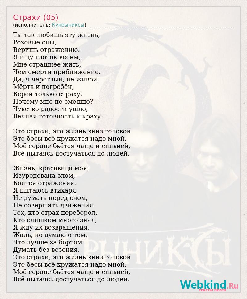 Ты так любишь эту жизнь, Розовые сны, Веришь отражению. Я ищу глоток весны, Мне страшнее жить, Чем смерти приближение. Да, я черствый, не живой, Мёртв и погребён, Верен только страху. Почему мне не смешно? Чувство радости ушло, Вечная готовность к краху. Это страхи, это жизнь вниз головой Это бесы всё кружатся надо мной. Моё сердце бьётся чаще и сильней, Всё пытаясь достучаться до людей. Жизнь, красавица моя, Изуродована злом, Боится отражения. Я пытаюсь втихаря Не думать перед сном, Не совершать движения. Тех, кто страх переборол, Кто слишком много знал, Я жду их возвращения. Жаль, но думаю о том, Что лучше за бортом Думать без везения. Это страхи, это жизнь вниз головой Это бесы всё кружатся надо мной. Моё сердце бьётся чаще и сильней, Всё пытаясь достучаться до людей.