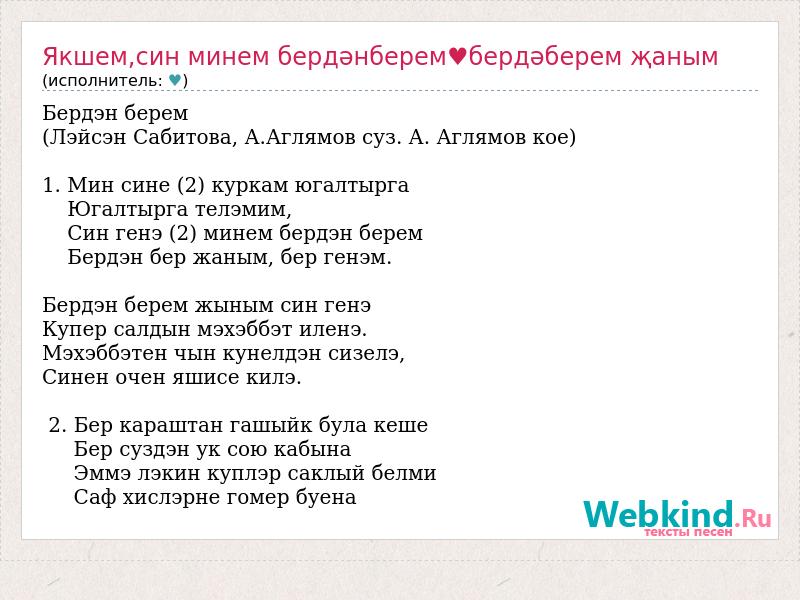 А как ты думаешь, о чем песня "Якшем,син минем бердәнберем♥бердәберем җаным" ?