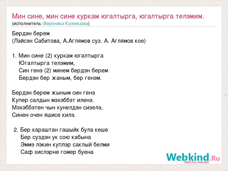 Главная→Исполнители→Вероника Кузнецова→Мин сине, мин сине куркам югалтырга, югалтырга телэмим. Син генэ, син генэ минем