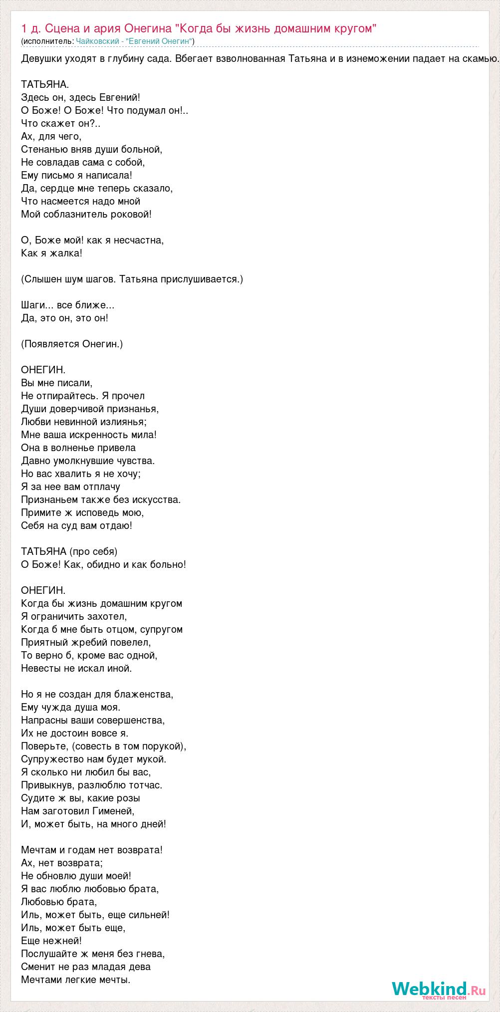 Девушки уходят в глубину сада. Вбегает взволнованная Татьяна и в изнеможении падает на скамью. ТАТЬЯНА. Здесь он, здесь Евгений! О Боже! О Боже! Что подумал он!.. Что скажет он?.. Ах, для чего, Стенанью вняв души больной, Не совладав сама с собой, Ему письмо я написала! Да, сердце мне теперь сказало, Что насмеется надо мной Мой соблазнитель роковой! О, Боже мой! как я несчастна, Как я жалка! (Слышен шум шагов. Татьяна прислушивается.) Шаги... все ближе... Да, это он, это он! (Появляется Онегин.) ОНЕГИН. Вы мне писали, Не отпирайтесь. Я прочел Души доверчивой признанья, Любви невинной излиянья; Мне ваша искренность мила! Она в волненье привела Давно умолкнувшие чувства. Но вас хвалить я не хочу; Я за нее вам отплачу Признаньем также без искусства. Примите ж исповедь мою, Себя на суд вам отдаю! ТАТЬЯНА (про себя) О Боже! Как, обидно и как больно! ОНЕГИН. Когда бы жизнь домашним кругом Я ограничить захотел, Когда б мне быть отцом, супругом Приятный жребий повелел, То верно б, кроме вас одной, Невесты не искал иной. Но я не создан для блаженства, Ему чужда душа моя. Напрасны ваши совершенства, Их не достоин вовсе я. Поверьте, (совесть в том порукой), Супружество нам будет мукой. Я сколько ни любил бы вас, Привыкнув, разлюблю тотчас. Судите ж вы, какие розы Нам заготовил Гименей, И, может быть, на много дней! Мечтам и годам нет возврата! Ах, нет возврата; Не обновлю души моей! Я вас люблю любовью брата, Любовью брата, Иль, может быть, еще сильней! Иль, может быть еще, Еще нежней! Послушайте ж меня без гнева, Сменит не раз младая дева Мечтами легкие мечты.