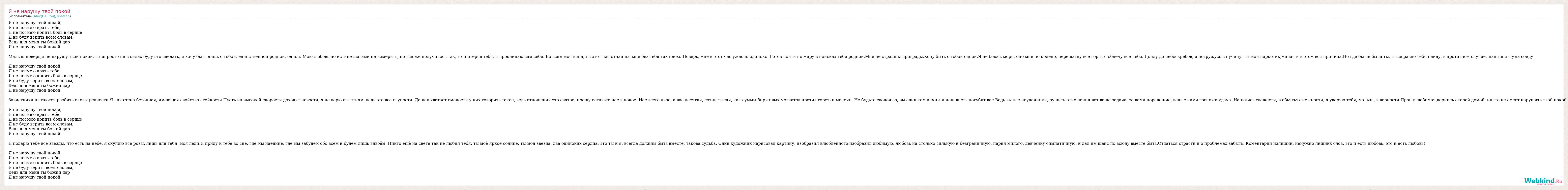 Я не нарушу твой покой, Я не посмею врать тебе, Я не посмею копить боль в сердце Я не буду верить всем словам, Ведь для меня ты божий дар Я не нарушу твой покой Малыш поверь,я не нарушу твой покой, я напросто не в силах буду это сделать, я хочу быть лишь с тобой, единственной родной, одной. Мою любовь по истине шагами не измерить, но всё же получилось так,что потеряв тебя, я проклинаю сам себя. Во всем моя вина,и в этот час отчаинья мне без тебя так плохо.Поверь, мне в этот час ужасно одиноко. Готов пойти по миру в поисках тебя родной.Мне не страшны приграды.Хочу быть с тобой одной.Я не боюсь моря, оно мне по колено, перешагну все горы, я облечу все небо. Дойду до небоскребов, я погружусь в пучину, ты мой наркотик,милая и в этом вся причина.Но где бы не была ты, я всё равно тебя найду, в противном случае, малыш я с ума сойду Я не нарушу твой покой, Я не посмею врать тебе, Я не посмею копить боль в сердце Я не буду верить всем словам, Ведь для меня ты божий дар Я не нарушу твой покой Завистники пытаются разбить оковы ревности.Я как стена бетонная, имеющая свойство стойкости.Пусть на высокой скорости доходят новости, я не верю сплетням, ведь это все глупости. Да как хватает смелости у них говорить такое, ведь отношения это святое, прошу оставьте нас в покое. Нас всего двое, а вас десятки, сотни тысяч, как суммы бирживых могнатов против горстки мелочи. Не будьте сволочью, вы слишком алчны и ненависть погубит вас.Ведь вы все неудачники, рушить отношения-вот ваша задача, за вами поражение, ведь с нами госпожа удача. Напились свежести, в обьятьях нежности, я уверяю тебя, малыш, в верности.Прошу любимая,вернись скорей домой, никто не смеет нарушить твой покой. Я не нарушу твой покой, Я не посмею врать тебе, Я не посмею копить боль в сердце Я не буду верить всем словам, Ведь для меня ты божий дар Я не нарушу твой покой Я подарю тебе все звезды, что есть на небе, я скуплю все розы, лишь для тебя ,моя леди.Я приду к тебе во сне, где мы наедине, где мы забудем обо всем и будем лишь вдвоём. Никто ещё на свете так не любил тебя, ты моё яркое солнце, ты моя звезда, два одиноких сердца: это ты и я, всегда должны быть вместе, такова судьба. Один художник нарисовал картину, изобразил влюбленного,изобразил любимую, любовь на столько сильную и безграничную, парня милого, девченку симпатичную, и дал им шанс по всюду вместе быть.Отдаться страсти и о проблемах забыть. Коментарии излишни, ненужно лишних слов, это и есть любовь, это и есть любовь! Я не нарушу твой покой, Я не посмею врать тебе, Я не посмею копить боль в сердце Я не буду верить всем словам, Ведь для меня ты божий дар Я не нарушу твой покой