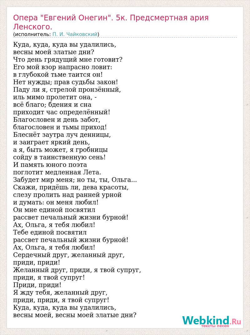Куда, куда, куда вы удалились, весны моей златые дни? Что день грядущий мне готовит? Его мой взор напрасно ловит: в глубокой тьме таится он! Нет нужды; прав судьбы закон! Паду ли я, стрелой пронзённый, иль мимо пролетит она, - всё благо; бдения и сна приходит час определённый! Благословен и день забот, благословен и тьмы приход! Блеснёт заутра луч денницы, и заиграет яркий день, а я, быть может, я гробницы сойду в таинственную сень! И память юного поэта поглотит медленная Лета. Забудет мир меня; но ты, ты, Ольга... Скажи, придёшь ли, дева красоты, слезу пролить над ранней урной и думать: он меня любил! Он мне единой посвятил рассвет печальный жизни бурной! Ах, Ольга, я тебя любил! Тебе единой посвятил рассвет печальный жизни бурной! Ах, Ольга, я тебя любил! Сердечный друг, желанный друг, приди, приди! Желанный друг, приди, я твой супруг, приди, я твой супруг! Приди, приди! Я жду тебя, желанный друг, приди, приди, я твой супруг! Куда, куда, куда вы удалились, весны моей, весны моей златые дни?