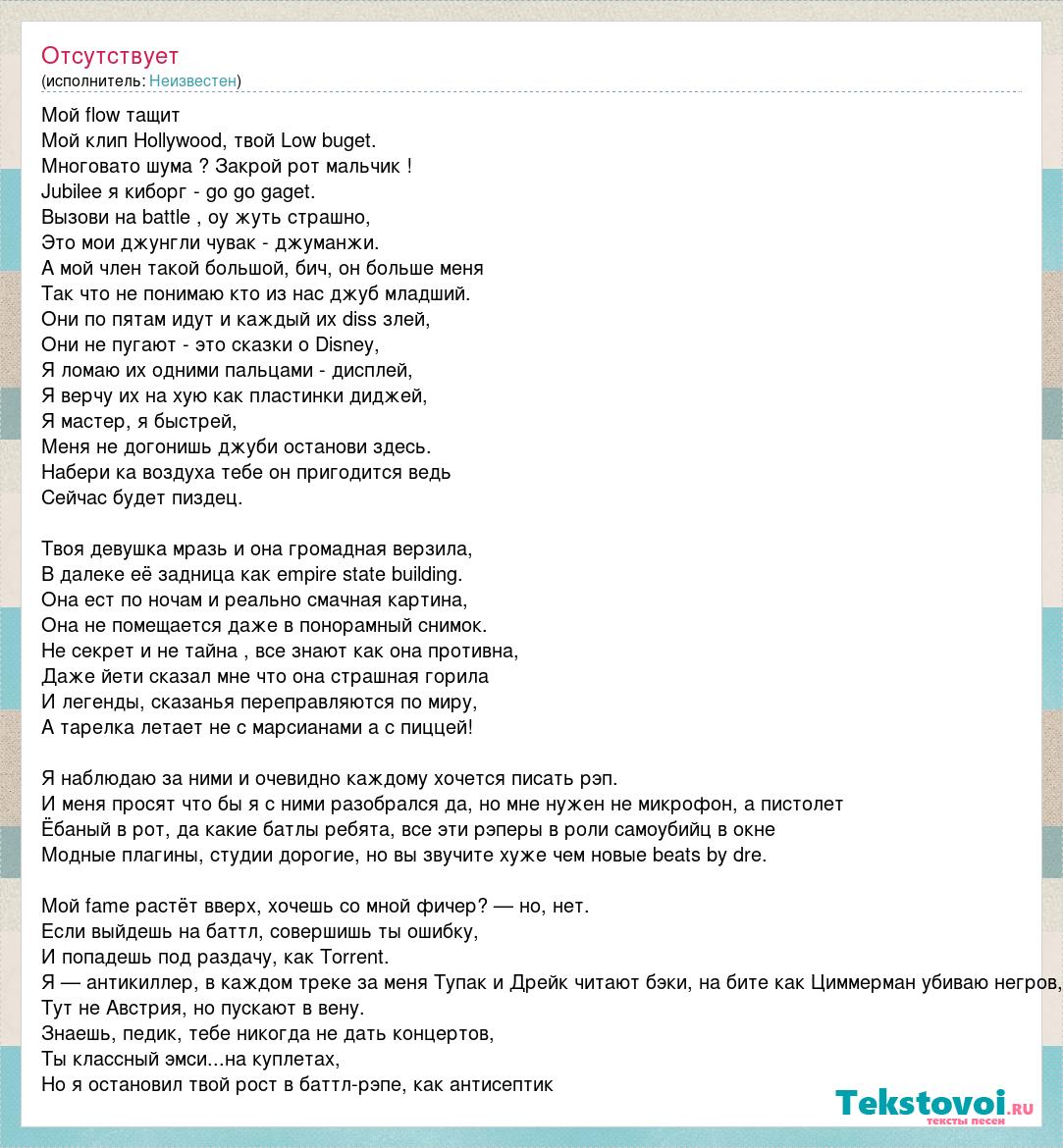 Мой flow тащит Мой клип Hollywood, твой Low buget. Многовато шума ? Закрой рот мальчик ! Jubilee я киборг - go go gaget. Вызови на battle , оу жуть страшно, Это мои джунгли чувак - джуманжи. А мой член такой большой, бич, он больше меня Так что не понимаю кто из нас джуб младший. Они по пятам идут и каждый их diss злей, Они не пугают - это сказки о Disney, Я ломаю их одними пальцами - дисплей, Я верчу их на хую как пластинки диджей, Я мастер, я быстрей, Меня не догонишь джуби останови здесь. Набери ка воздуха тебе он пригодится ведь Сейчас будет пиздец. Твоя девушка мразь и она громадная верзила, В далеке её задница как empire state building. Она ест по ночам и реально смачная картина, Она не помещается даже в понорамный снимок. Не секрет и не тайна , все знают как она противна, Даже йети сказал мне что она страшная горила И легенды, сказанья переправляются по миру, А тарелка летает не с марсианами а с пиццей! Я наблюдаю за ними и очевидно каждому хочется писать рэп. И меня просят что бы я с ними разобрался да, но мне нужен не микрофон, а пистолет Ёбаный в рот, да какие батлы ребята, все эти рэперы в роли самоубийц в окне Модные плагины, студии дорогие, но вы звучите хуже чем новые beats by dre. Мой fame растёт вверх, хочешь со мной фичер? — но, нет. Если выйдешь на баттл, совершишь ты ошибку, И попадешь под раздачу, как Torrent. Я — антикиллер, в каждом треке за меня Тупак и Дрейк читают бэки, на бите как Циммерман убиваю негров, Тут не Австрия, но пускают в вену. Знаешь, педик, тебе никогда не дать концертов, Ты классный эмси...на куплетах, Но я остановил твой рост в баттл-рэпе, как антисептик