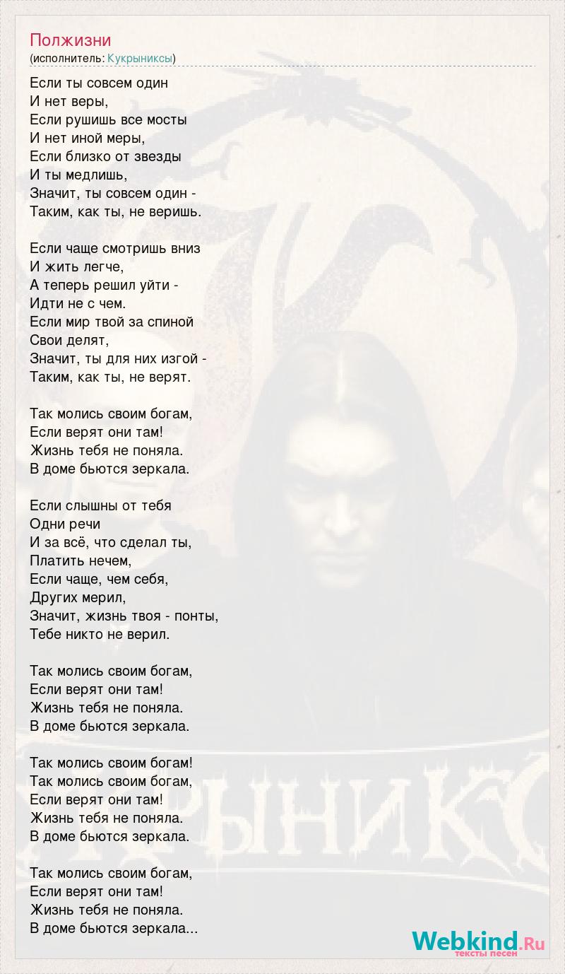 Если ты совсем один И нет веры, Если рушишь все мосты И нет иной меры, Если близко от звезды И ты медлишь, Значит, ты совсем один - Таким, как ты, не веришь. Если чаще смотришь вниз И жить легче, А теперь решил уйти - Идти не с чем. Если мир твой за спиной Свои делят, Значит, ты для них изгой - Таким, как ты, не верят. Так молись своим богам, Если верят они там! Жизнь тебя не поняла. В доме бьются зеркала. Если слышны от тебя Одни речи И за всё, что сделал ты, Платить нечем, Если чаще, чем себя, Других мерил, Значит, жизнь твоя - понты, Тебе никто не верил. Так молись своим богам, Если верят они там! Жизнь тебя не поняла. В доме бьются зеркала. Так молись своим богам! Так молись своим богам, Если верят они там! Жизнь тебя не поняла. В доме бьются зеркала. Так молись своим богам, Если верят они там! Жизнь тебя не поняла. В доме бьются зеркала...