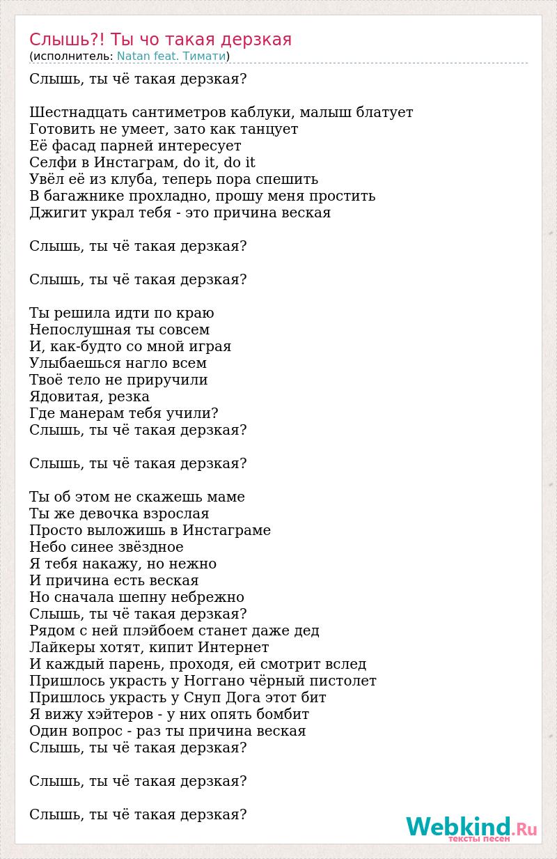 Слышь, ты чё такая дерзкая? Шестнадцать сантиметров каблуки, малыш блатует Готовить не умеет, зато как танцует Её фасад парней интересует Селфи в Инстаграм, do it, do it Увёл её из клуба, теперь пора спешить В багажнике прохладно, прошу меня простить Джигит украл тебя - это причина веская Слышь, ты чё такая дерзкая? Слышь, ты чё такая дерзкая? Ты решила идти по краю Непослушная ты совсем И, как-будто со мной играя Улыбаешься нагло всем Твоё тело не приручили Ядовитая, резка Где манерам тебя учили? Слышь, ты чё такая дерзкая? Слышь, ты чё такая дерзкая? Ты об этом не скажешь маме Ты же девочка взрослая Просто выложишь в Инстаграме Небо синее звёздное Я тебя накажу, но нежно И причина есть веская Но сначала шепну небрежно Слышь, ты чё такая дерзкая? Рядом с ней плэйбоем станет даже дед Лайкеры хотят, кипит Интернет И каждый парень, проходя, ей смотрит вслед Пришлось украсть у Ноггано чёрный пистолет Пришлось украсть у Снуп Дога этот бит Я вижу хэйтеров - у них опять бомбит Один вопрос - раз ты причина веская Слышь, ты чё такая дерзкая? Слышь, ты чё такая дерзкая? Слышь, ты чё такая дерзкая?