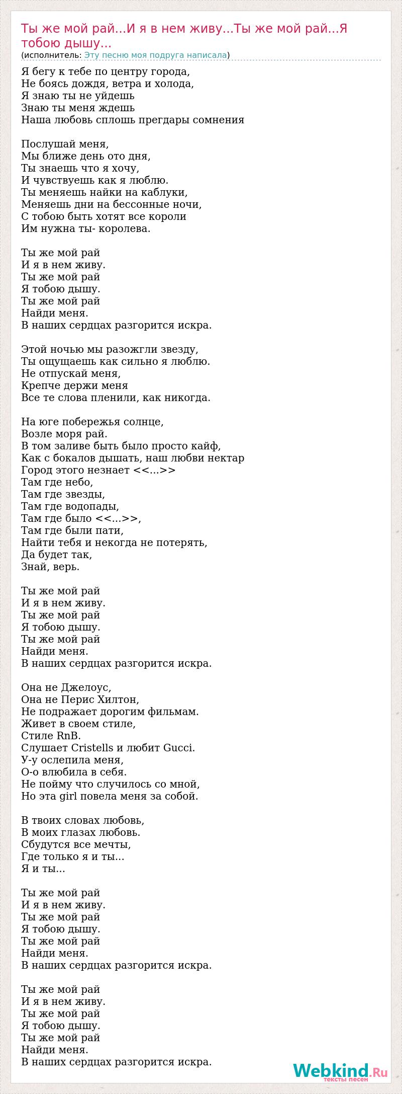Я бегу к тебе по центру города, Не боясь дождя, ветра и холода, Я знаю ты не уйдешь Знаю ты меня ждешь Наша любовь сплошь прегдары сомнения Послушай меня, Мы ближе день ото дня, Ты знаешь что я хочу, И чувствуешь как я люблю. Ты меняешь найки на каблуки, Меняешь дни на бессонные ночи, С тобою быть хотят все короли Им нужна ты- королева. Ты же мой рай И я в нем живу. Ты же мой рай Я тобою дышу. Ты же мой рай Найди меня. В наших сердцах разгорится искра. Этой ночью мы разожгли звезду, Ты ощущаешь как сильно я люблю. Не отпускай меня, Крепче держи меня Все те слова пленили, как никогда. На юге побережья cолнце, Возле моря рай. В том заливе быть было просто кайф, Как с бокалов дышать, наш любви нектар Город этого незнает <<...>> Там где небо, Там где звезды, Там где водопады, Там где было <<...>>, Там где были пати, Найти тебя и некогда не потерять, Да будет так, Знай, верь. Ты же мой рай И я в нем живу. Ты же мой рай Я тобою дышу. Ты же мой рай Найди меня. В наших сердцах разгорится искра. Она не Джелоус, Она не Перис Хилтон, Не подражает дорогим фильмам. Живет в своем стиле, Стиле RnB. Cлушает Cristells и любит Gucci. У-у ослепила меня, О-о влюбила в себя. Не пойму что случилось со мной, Но эта girl повела меня за собой. В твоих словах любовь, В моих глазах любовь. Сбудутся все мечты, Где только я и ты... Я и ты... Ты же мой рай И я в нем живу. Ты же мой рай Я тобою дышу. Ты же мой рай Найди меня. В наших сердцах разгорится искра. Ты же мой рай И я в нем живу. Ты же мой рай Я тобою дышу. Ты же мой рай Найди меня. В наших сердцах разгорится искра.