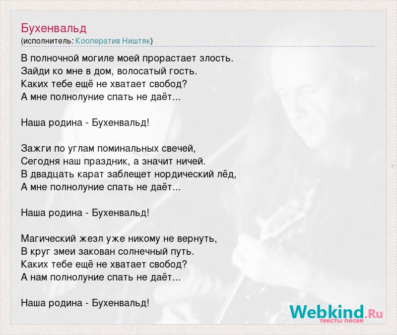 В полночной могиле моей прорастает злость. Зайди ко мне в дом, волосатый гость. Каких тебе ещё не хватает свобод? А мне полнолуние спать не даёт... Наша родина - Бухенвальд! Зажги по углам поминальных свечей, Сегодня наш праздник, а значит ничей. В двадцать карат заблещет нордический лёд, А мне полнолуние спать не даёт... Наша родина - Бухенвальд! Магический жезл уже никому не вернуть, В круг змеи закован солнечный путь. Каких тебе ещё не хватает свобод? А нам полнолуние спать не даёт... Наша родина - Бухенвальд!