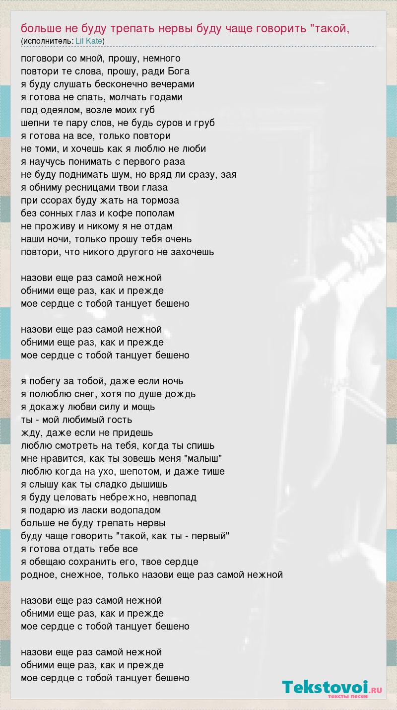 поговори со мной, прошу, немного повтори те слова, прошу, ради Бога я буду слушать бесконечно вечерами я готова не спать, молчать годами под одеялом, возле моих губ шепни те пару слов, не будь суров и груб я готова на все, только повтори не томи, и хочешь как я люблю не люби я научусь понимать с первого раза не буду поднимать шум, но вряд ли сразу, зая я обниму ресницами твои глаза при ссорах буду жать на тормоза без сонных глаз и кофе пополам не проживу и никому я не отдам наши ночи, только прошу тебя очень повтори, что никого другого не захочешь назови еще раз самой нежной обними еще раз, как и прежде мое сердце с тобой танцует бешено назови еще раз самой нежной обними еще раз, как и прежде мое сердце с тобой танцует бешено я побегу за тобой, даже если ночь я полюблю снег, хотя по душе дождь я докажу любви силу и мощь ты - мой любимый гость жду, даже если не придешь люблю смотреть на тебя, когда ты спишь мне нравится, как ты зовешь меня "малыш" люблю когда на ухо, шепотом, и даже тише я слышу как ты сладко дышишь я буду целовать небрежно, невпопад я подарю из ласки водопадом больше не буду трепать нервы буду чаще говорить "такой, как ты - первый" я готова отдать тебе все я обещаю сохранить его, твое сердце родное, снежное, только назови еще раз самой нежной назови еще раз самой нежной обними еще раз, как и прежде мое сердце с тобой танцует бешено назови еще раз самой нежной обними еще раз, как и прежде мое сердце с тобой танцует бешено