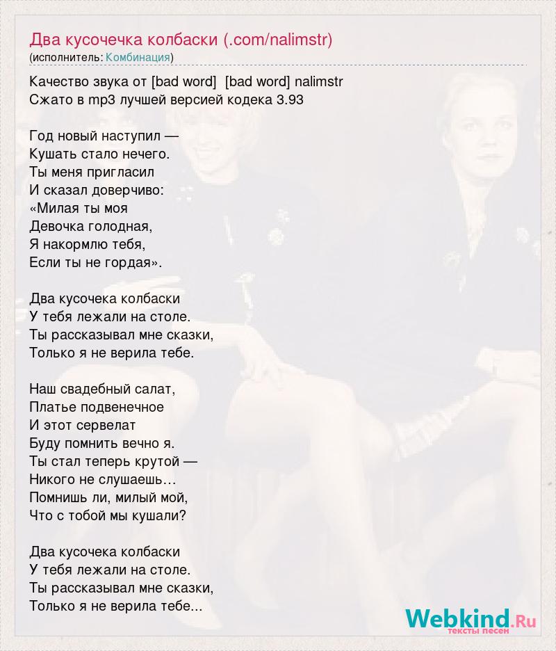 Качество звука от [bad word] [bad word] nalimstr Сжато в mp3 лучшей версией кодека 3.93 Год новый наступил — Кушать стало нечего. Ты меня пригласил И сказал доверчиво: «Милая ты моя Девочка голодная, Я накормлю тебя, Если ты не гордая». Два кусочека колбаски У тебя лежали на столе. Ты рассказывал мне сказки, Только я не верила тебе. Наш свадебный салат, Платье подвенечное И этот сервелат Буду помнить вечно я. Ты стал теперь крутой — Никого не слушаешь… Помнишь ли, милый мой, Что с тобой мы кушали? Два кусочека колбаски У тебя лежали на столе. Ты рассказывал мне сказки, Только я не верила тебе...