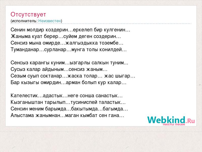 Сенин молдир коздерин…еркелеп бир кулгенин… Жаныма куат берер…суйем деген создерин… Сенсиз мына омирде…жалгыздыкка тозембе… Туманданар…сурланар…мунга толы конилдей… Сенсыз карангы куним…ызгарлы салкын туним... Сусыз калар айдыным…сенсиз жаным… Сезым суып соктанар…жаска толар… жас шыгар… Бар кызыгы омирдин…арман болып кур калар… Кателестик…адастык…неге сонша санастык… Кызганыштан тарылып…тусиниспей таластык… Сенсин меним барымда…бакытымда…багымда… Алыстама жанымнан…маган кымбат сен гана…