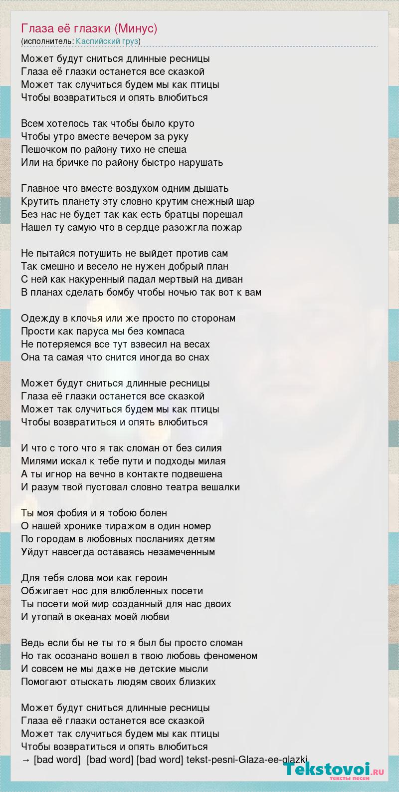Может будут сниться длинные ресницы Глаза её глазки останется все сказкой Может так случиться будем мы как птицы Чтобы возвратиться и опять влюбиться Всем хотелось так чтобы было круто Чтобы утро вместе вечером за руку Пешочком по району тихо не спеша Или на бричке по району быстро нарушать Главное что вместе воздухом одним дышать Крутить планету эту словно крутим снежный шар Без нас не будет так как есть братцы порешал Нашел ту самую что в сердце разожгла пожар Не пытайся потушить не выйдет против сам Так смешно и весело не нужен добрый план С ней как накуренный падал мертвый на диван В планах сделать бомбу чтобы ночью так вот к вам Одежду в клочья или же просто по сторонам Прости как паруса мы без компаса Не потеряемся все тут взвесил на весах Она та самая что снится иногда во снах Может будут сниться длинные ресницы Глаза её глазки останется все сказкой Может так случиться будем мы как птицы Чтобы возвратиться и опять влюбиться И что с того что я так сломан от без силия Милями искал к тебе пути и подходы милая А ты игнор на вечно в контакте подвешена И разум твой пустовал словно театра вешалки Ты моя фобия и я тобою болен О нашей хронике тиражом в один номер По городам в любовных посланиях детям Уйдут навсегда оставаясь незамеченным Для тебя слова мои как героин Обжигает нос для влюбленных посети Ты посети мой мир созданный для нас двоих И утопай в океанах моей любви Ведь если бы не ты то я был бы просто сломан Но так осознано вошел в твою любовь феноменом И совсем не мы даже не детские мысли Помогают отыскать людям своих близких Может будут сниться длинные ресницы Глаза её глазки останется все сказкой Может так случиться будем мы как птицы Чтобы возвратиться и опять влюбиться → [bad word] [bad word] 10/Kaspiyskiy-Gruz/tekst-pesni-Glaza-ee-glazki