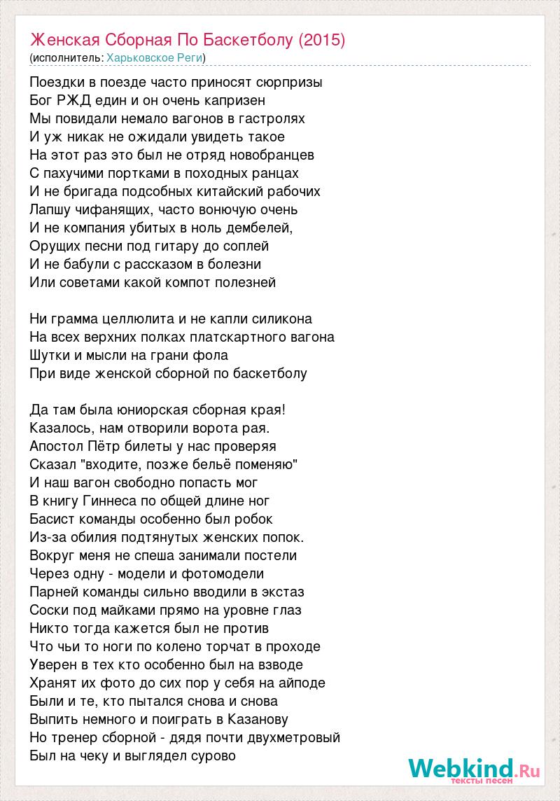 Поездки в поезде часто приносят сюрпризы Бог РЖД един и он очень капризен Мы повидали немало вагонов в гастролях И уж никак не ожидали увидеть такое На этот раз это был не отряд новобранцев С пахучими портками в походных ранцах И не бригада подсобных китайский рабочих Лапшу чифанящих, часто вонючую очень И не компания убитых в ноль дембелей, Орущих песни под гитару до соплей И не бабули с рассказом в болезни Или советами какой компот полезней Ни грамма целлюлита и не капли силикона На всех верхних полках платскартного вагона Шутки и мысли на грани фола При виде женской сборной по баскетболу Да там была юниорская сборная края! Казалось, нам отворили ворота рая. Апостол Пётр билеты у нас проверяя Сказал "входите, позже бельё поменяю" И наш вагон свободно попасть мог В книгу Гиннеса по общей длине ног Басист команды особенно был робок Из-за обилия подтянутых женских попок. Вокруг меня не спеша занимали постели Через одну - модели и фотомодели Парней команды сильно вводили в экстаз Соски под майками прямо на уровне глаз Никто тогда кажется был не против Что чьи то ноги по колено торчат в проходе Уверен в тех кто особенно был на взводе Хранят их фото до сих пор у себя на айподе Были и те, кто пытался снова и снова Выпить немного и поиграть в Казанову Но тренер сборной - дядя почти двухметровый Был на чеку и выглядел сурово