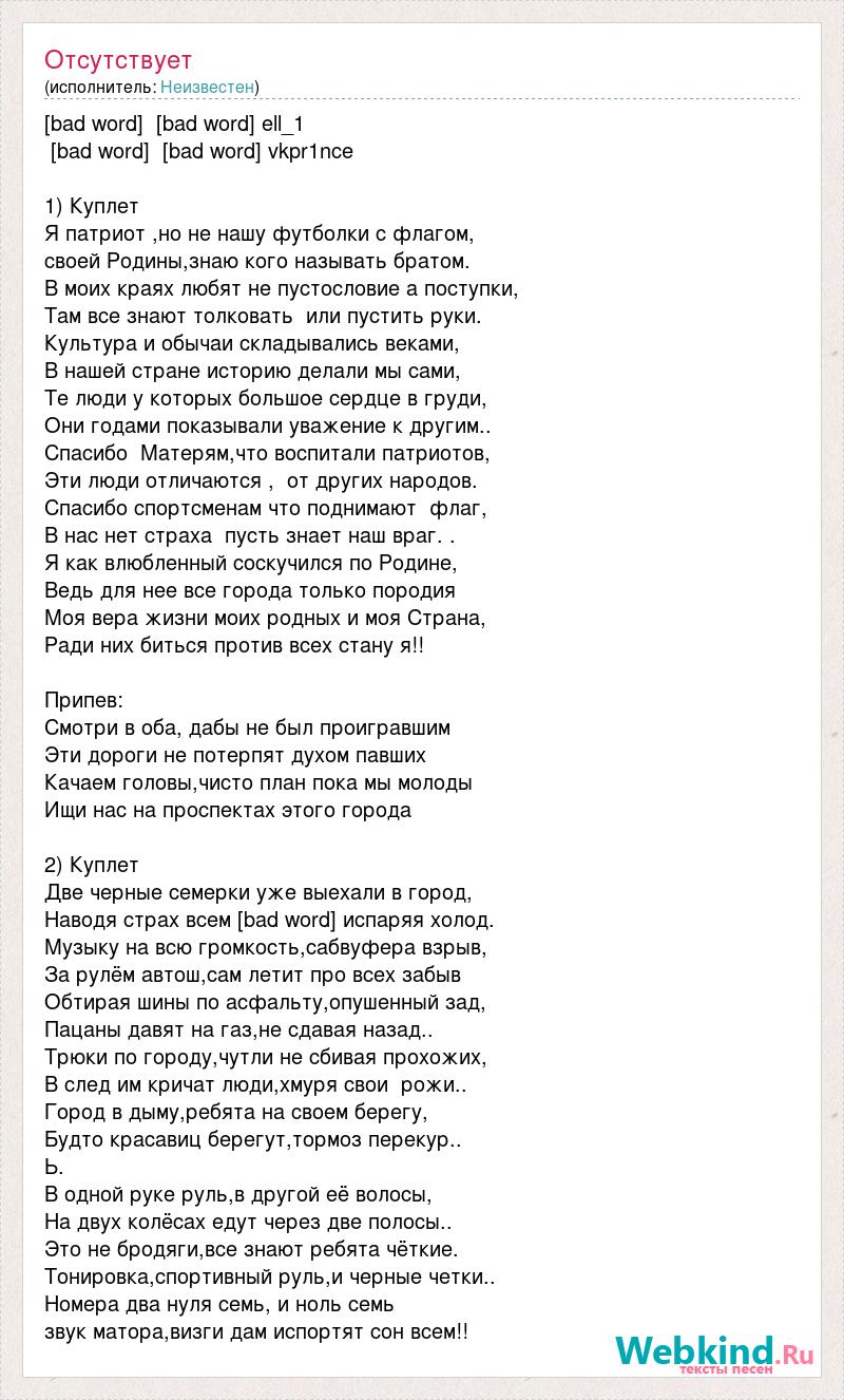 [bad word] [bad word] ell_1 [bad word] [bad word] vkpr1nce 1) Куплет Я патриот ,но не нашу футболки с флагом, своей Родины,знаю кого называть братом. В моих краях любят не пустословие а поступки, Там все знают толковать или пустить руки. Культура и обычаи складывались веками, В нашей стране историю делали мы сами, Те люди у которых большое сердце в груди, Они годами показывали уважение к другим.. Спасибо Матерям,что воспитали патриотов, Эти люди отличаются , от других народов. Спасибо спортсменам что поднимают флаг, В нас нет страха пусть знает наш враг. . Я как влюбленный соскучился по Родине, Ведь для нее все города только породия Моя вера жизни моих родных и моя Страна, Ради них биться против всех стану я!! Припев: Смотри в оба, дабы не был проигравшим Эти дороги не потерпят духом павших Качаем головы,чисто план пока мы молоды Ищи нас на проспектах этого города 2) Куплет Две черные семерки уже выехали в город, Наводя страх всем [bad word] испаряя холод. Музыку на всю громкость,сабвуфера взрыв, За рулём автош,сам летит про всех забыв Обтирая шины по асфальту,опушенный зад, Пацаны давят на газ,не сдавая назад.. Трюки по городу,чутли не сбивая прохожих, В след им кричат люди,хмуря свои рожи.. Город в дыму,ребята на своем берегу, Будто красавиц берегут,тормоз перекур.. Ь. В одной руке руль,в другой её волосы, На двух колёсах едут через две полосы.. Это не бродяги,все знают ребята чёткие. Тонировка,спортивный руль,и черные четки.. Номера два нуля семь, и ноль семь звук матора,визги дам испортят сон всем!!