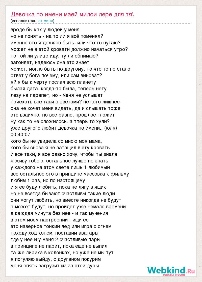 вроде бы как у людей у меня но не понять - на то ли я всё поменял? именно это и должно быть, или что то путаю? может не в этой кровати должно начаться утро? по той ли улице иду, ту ли обнимаю? загоняет, надеюсь она это знает может, могло быть по другому, но что то не стало ответ у бога почему, или сам виноват? я? я бы к черту послал всю планету былая дата. когда-то была, теперь нету лезу на парапет, но - меня не услышат приехать все таки с цветами? нет,это лишнее она не хочет меня видеть, да и слышать тоже это взаимно, но все равно, прошлое гложит ну как то не сложилось. а тперь то хули? уже другого любит девочка по имени.. (юля) 00:40:07 кого бы не увидела со мною моя мама, кого бы снова я не затащил в эту кровать и все таки, я все равно хочу, чтобы ты знала я живу тобою. остальное лучше не знать у каждого на этом свете лишь 1 любимый все остальное это в принципе массовка к фильму любим 1 раз, но по настоящему и я ее буду любить, пока не лягу в ящик но не всегда бывают счастливы такие люди они могут любить, но вместе никогда не будут а может будут, но пройдет уже немало времени а каждая минута без нее - и так мучения в этом моем настроении - ищи ее это наверное тонкий лед или игра с огнем походу ход конем, поставим аватары где у нее и у меня 2 счастливые пары в принципе не парит, пока еще не выпил та же лирика в колонках, но уже не мы тут я погуляю выйду, с друганом покурим меня опять загрузит из за этой дуры