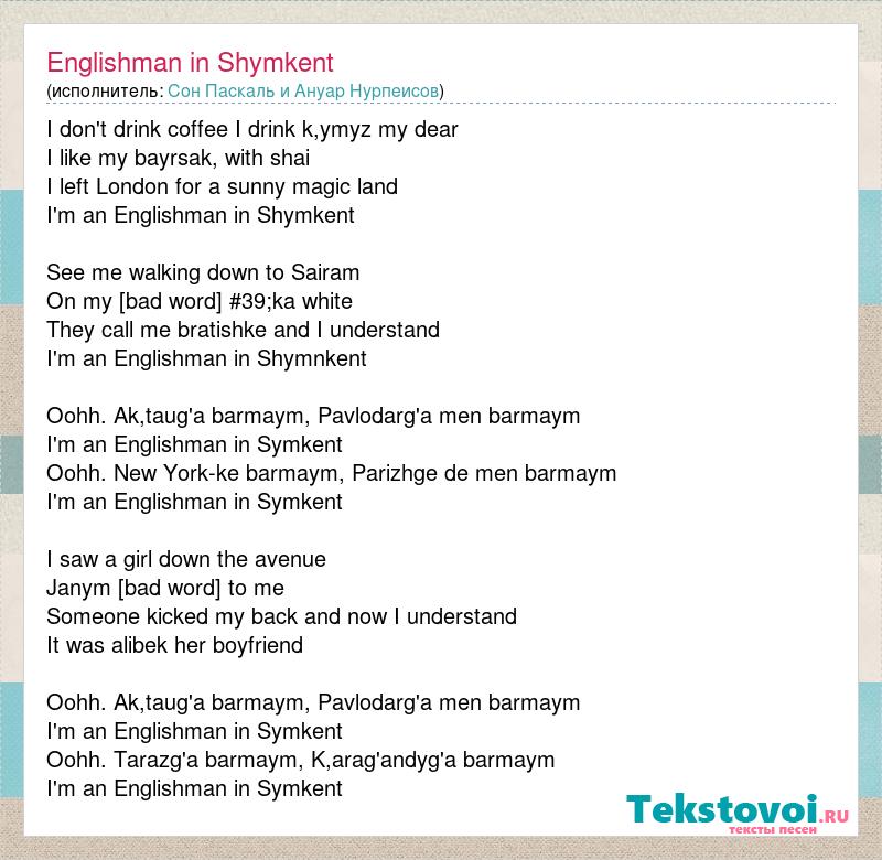 I don't drink coffee I drink k,ymyz my dear I like my bayrsak, with shai I left London for a sunny magic land I'm an Englishman in Shymkent See me walking down to Sairam On my [bad word] #39;ka white They call me bratishke and I understand I'm an Englishman in Shymnkent Oohh. Ak,taug'a barmaym, Pavlodarg'a men barmaym I'm an Englishman in Symkent Oohh. New York-ke barmaym, Parizhge de men barmaym I'm an Englishman in Symkent I saw a girl down the avenue Janym [bad word] to me Someone kicked my back and now I understand It was alibek her boyfriend Oohh. Ak,taug'a barmaym, Pavlodarg'a men barmaym I'm an Englishman in Symkent Oohh. Tarazg'a barmaym, K,arag'andyg'a barmaym I'm an Englishman in Symkent