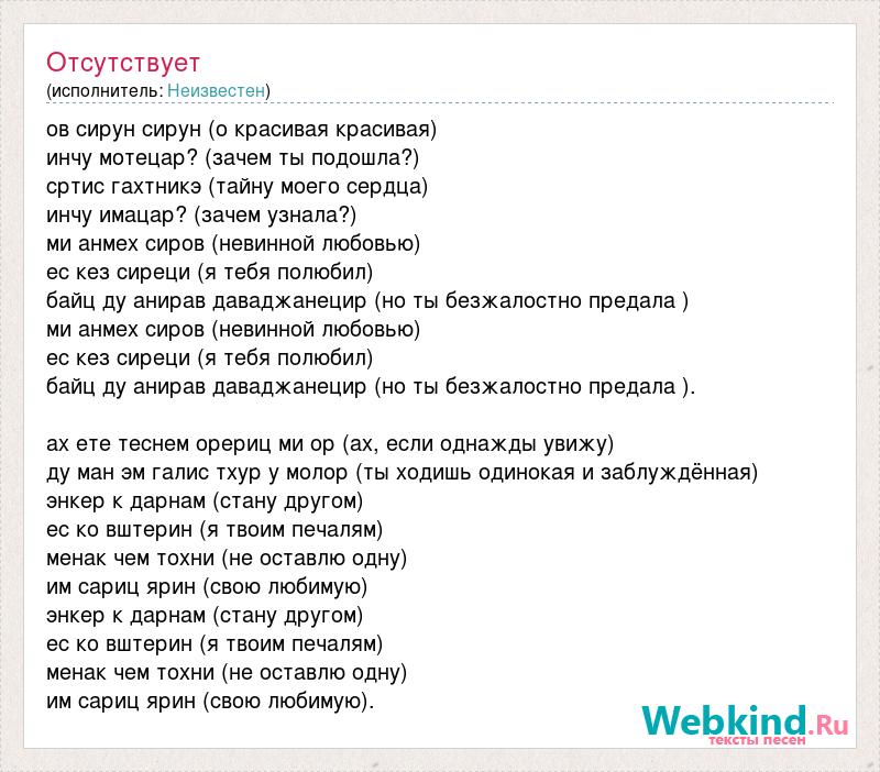 ов сирун сирун (о красивая красивая) инчу мотецар? (зачем ты подошла?) сртис гахтникэ (тайну моего сердца) инчу имацар? (зачем узнала?) ми анмех сиров (невинной любовью) ес кез сиреци (я тебя полюбил) байц ду анирав даваджанецир (но ты безжалостно предала ) ми анмех сиров (невинной любовью) ес кез сиреци (я тебя полюбил) байц ду анирав даваджанецир (но ты безжалостно предала ). ах ете теснем орериц ми ор (ах, если однажды увижу) ду ман эм галис тхур у молор (ты ходишь одинокая и заблуждённая) энкер к дарнам (стану другом) ес ко вштерин (я твоим печалям) менак чем тохни (не оставлю одну) им сариц ярин (свою любимую) энкер к дарнам (стану другом) ес ко вштерин (я твоим печалям) менак чем тохни (не оставлю одну) им сариц ярин (свою любимую).