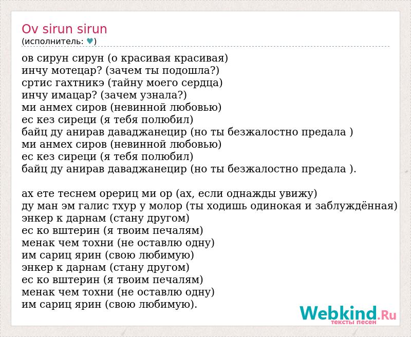 ов сирун сирун (о красивая красивая) инчу мотецар? (зачем ты подошла?) сртис гахтникэ (тайну моего сердца) инчу имацар? (зачем узнала?) ми анмех сиров (невинной любовью) ес кез сиреци (я тебя полюбил) байц ду анирав даваджанецир (но ты безжалостно предала ) ми анмех сиров (невинной любовью) ес кез сиреци (я тебя полюбил) байц ду анирав даваджанецир (но ты безжалостно предала ). ах ете теснем орериц ми ор (ах, если однажды увижу) ду ман эм галис тхур у молор (ты ходишь одинокая и заблуждённая) энкер к дарнам (стану другом) ес ко вштерин (я твоим печалям) менак чем тохни (не оставлю одну) им сариц ярин (свою любимую) энкер к дарнам (стану другом) ес ко вштерин (я твоим печалям) менак чем тохни (не оставлю одну) им сариц ярин (свою любимую).