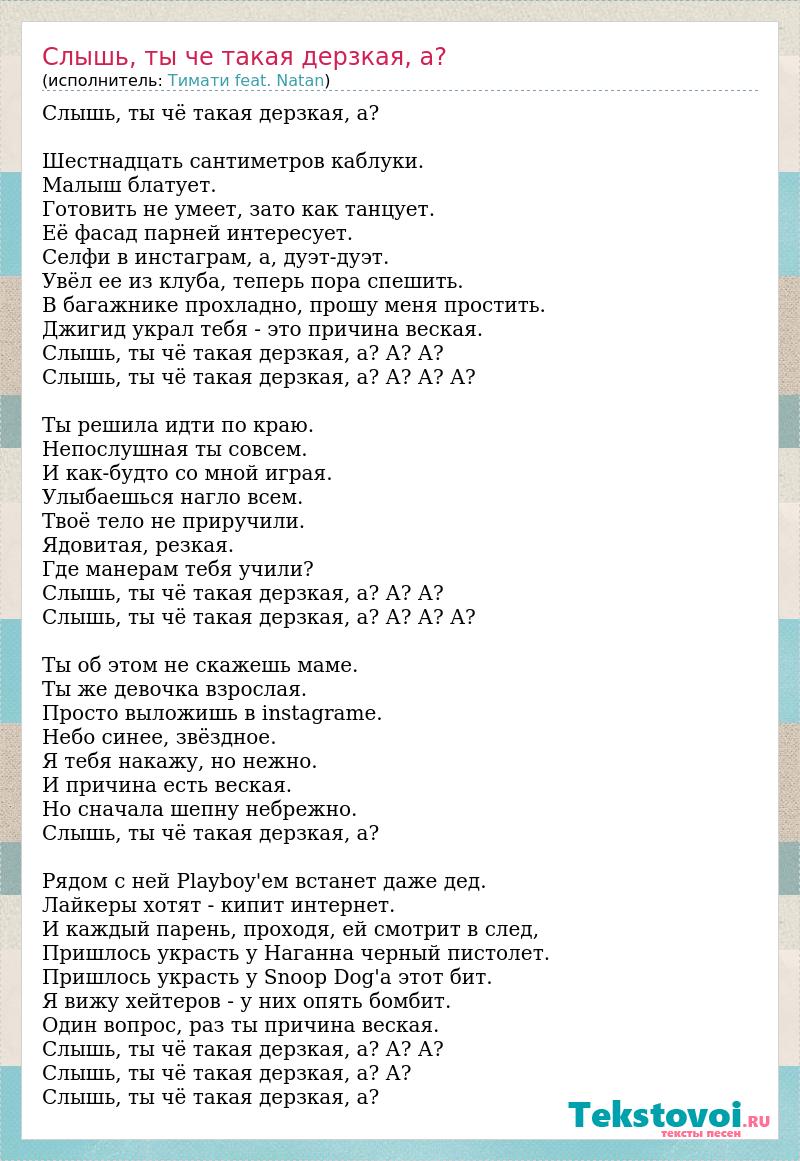 Слышь, ты чё такая дерзкая, а? Шестнадцать сантиметров каблуки. Малыш блатует. Готовить не умеет, зато как танцует. Её фасад парней интересует. Селфи в инстаграм, а, дуэт-дуэт. Увёл ее из клуба, теперь пора спешить. В багажнике прохладно, прошу меня простить. Джигид украл тебя - это причина веская. Слышь, ты чё такая дерзкая, а? А? А? Слышь, ты чё такая дерзкая, а? А? А? А? Ты решила идти по краю. Непослушная ты совсем. И как-будто со мной играя. Улыбаешься нагло всем. Твоё тело не приручили. Ядовитая, резкая. Где манерам тебя учили? Слышь, ты чё такая дерзкая, а? А? А? Слышь, ты чё такая дерзкая, а? А? А? А? Ты об этом не скажешь маме. Ты же девочка взрослая. Просто выложишь в instagramе. Небо синее, звёздное. Я тебя накажу, но нежно. И причина есть веская. Но сначала шепну небрежно. Слышь, ты чё такая дерзкая, а? Рядом с ней Plаyboy'ем встанет даже дед. Лайкеры хотят - кипит интернет. И каждый парень, проходя, ей смотрит в след, Пришлось украсть у Наганна черный пистолет. Пришлось украсть у Snoop Dog'а этот бит. Я вижу хейтеров - у них опять бомбит. Один вопрос, раз ты причина веская. Слышь, ты чё такая дерзкая, а? А? А? Слышь, ты чё такая дерзкая, а? А? Слышь, ты чё такая дерзкая, а?