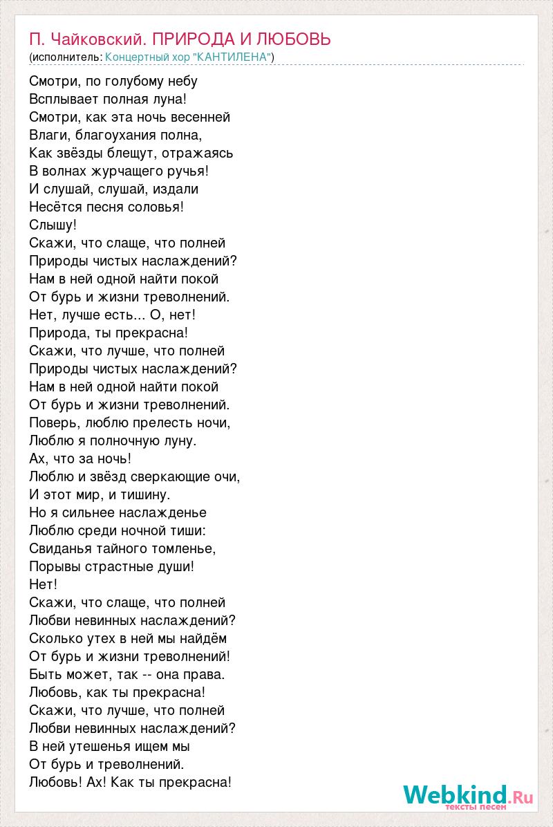 Смотри, по голубому небу Всплывает полная луна! Смотри, как эта ночь весенней Влаги, благоухания полна, Как звёзды блещут, отражаясь В волнах журчащего ручья! И слушай, слушай, издали Несётся песня соловья! Слышу! Скажи, что слаще, что полней Природы чистых наслаждений? Нам в ней одной найти покой От бурь и жизни треволнений. Нет, лучше есть... О, нет! Природа, ты прекрасна! Скажи, что лучше, что полней Природы чистых наслаждений? Нам в ней одной найти покой От бурь и жизни треволнений. Поверь, люблю прелесть ночи, Люблю я полночную луну. Ах, что за ночь! Люблю и звёзд сверкающие очи, И этот мир, и тишину. Но я сильнее наслажденье Люблю среди ночной тиши: Свиданья тайного томленье, Порывы страстные души! Нет! Скажи, что слаще, что полней Любви невинных наслаждений? Сколько утех в ней мы найдём От бурь и жизни треволнений! Быть может, так -- она права. Любовь, как ты прекрасна! Скажи, что лучше, что полней Любви невинных наслаждений? В ней утешенья ищем мы От бурь и треволнений. Любовь! Ах! Как ты прекрасна!
