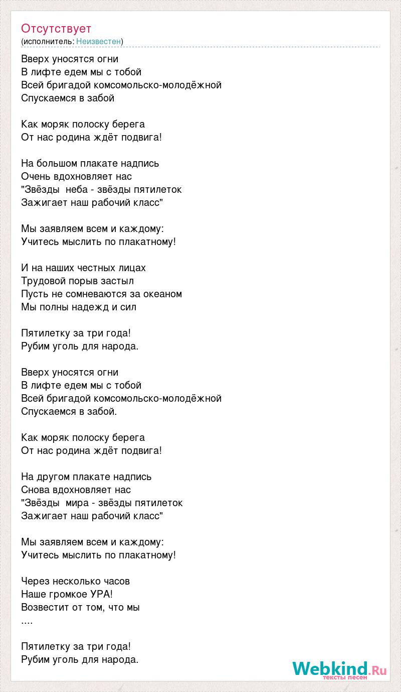 Вверх уносятся огни В лифте едем мы с тобой Всей бригадой комсомольско-молодёжной Спускаемся в забой Как моряк полоску берега От нас родина ждёт подвига! На большом плакате надпись Очень вдохновляет нас "Звёзды неба - звёзды пятилеток Зажигает наш рабочий класс" Мы заявляем всем и каждому: Учитесь мыслить по плакатному! И на наших честных лицах Трудовой порыв застыл Пусть не сомневаются за океаном Мы полны надежд и сил Пятилетку за три года! Рубим уголь для народа. Вверх уносятся огни В лифте едем мы с тобой Всей бригадой комсомольско-молодёжной Спускаемся в забой. Как моряк полоску берега От нас родина ждёт подвига! На другом плакате надпись Снова вдохновляет нас "Звёзды мира - звёзды пятилеток Зажигает наш рабочий класс" Мы заявляем всем и каждому: Учитесь мыслить по плакатному! Через несколько часов Наше громкое УРА! Возвестит от том, что мы .... Пятилетку за три года! Рубим уголь для народа.