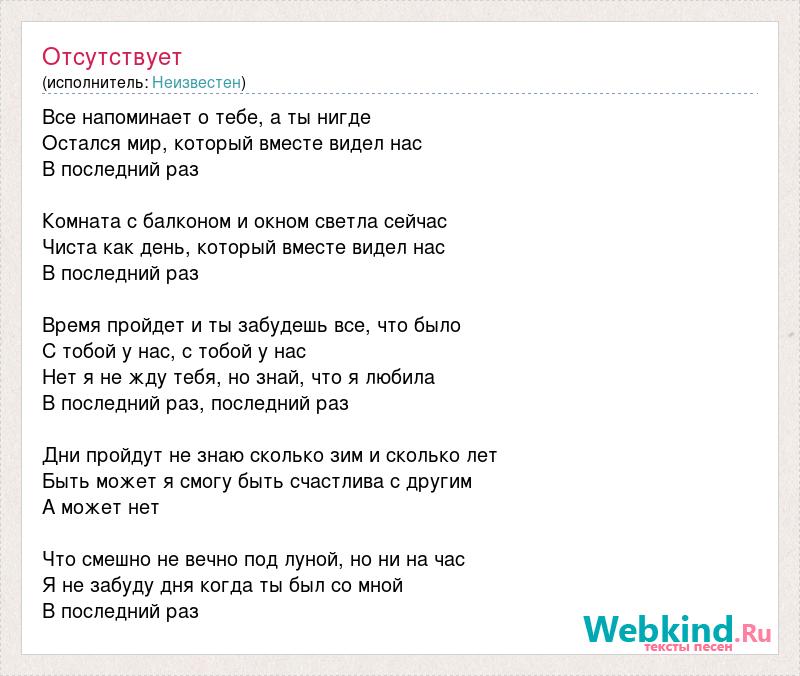 Все напоминает о тебе, а ты нигде Остался мир, который вместе видел нас В последний раз Комната с балконом и окном светла сейчас Чиста как день, который вместе видел нас В последний раз Время пройдет и ты забудешь все, что было С тобой у нас, с тобой у нас Нет я не жду тебя, но знай, что я любила В последний раз, последний раз Дни пройдут не знаю сколько зим и сколько лет Быть может я смогу быть счастлива с другим А может нет Что смешно не вечно под луной, но ни на час Я не забуду дня когда ты был со мной В последний раз