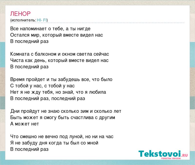 Все напоминает о тебе, а ты нигде Остался мир, который вместе видел нас В последний раз Комната с балконом и окном светла сейчас Чиста как день, который вместе видел нас В последний раз Время пройдет и ты забудешь все, что было С тобой у нас, с тобой у нас Нет я не жду тебя, но знай, что я любила В последний раз, последний раз Дни пройдут не знаю сколько зим и сколько лет Быть может я смогу быть счастлива с другим А может нет Что смешно не вечно под луной, но ни на час Я не забуду дня когда ты был со мной В последний раз