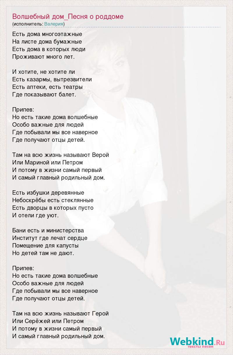 Есть дома многоэтажные На листе дома бумажные Есть дома в которых люди Проживают много лет. И хотите, не хотите ли Есть казармы, вытрезвители Есть аптеки, есть театры Где показывают балет. Припев: Но есть такие дома волшебные Особо важные для людей Где побывали мы все наверное Где получают отцы детей. Там на всю жизнь называют Верой Или Мариной или Петром И потому в жизни самый первый И самый главный родильный дом. Есть избушки деревянные Небоскрёбы есть стеклянные Есть дворцы в которых пусто И отели где уют. Бани есть и министерства Институт где лечат сердце Помещение для капусты Но детей там не дают. Припев: Но есть такие дома волшебные Особо важные для людей Где побывали мы все наверное Где получают отцы детей. Там на всю жизнь называют Герой Или Серёжей или Петром И потому в жизни самый первый И самый главный родильный дом.
