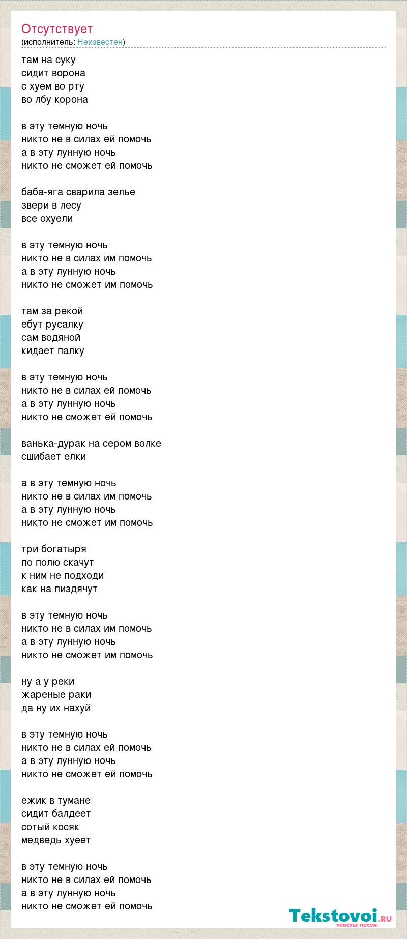 там на суку сидит ворона с хуем во рту во лбу корона в эту темную ночь никто не в силах ей помочь а в эту лунную ночь никто не сможет ей помочь баба-яга сварила зелье звери в лесу все охуели в эту темную ночь никто не в силах им помочь а в эту лунную ночь никто не сможет им помочь там за рекой ебут русалку сам водяной кидает палку в эту темную ночь никто не в силах ей помочь а в эту лунную ночь никто не сможет ей помочь ванька-дурак на сером волке сшибает елки а в эту темную ночь никто не в силах им помочь а в эту лунную ночь никто не сможет им помочь три богатыря по полю скачут к ним не подходи как на пиздячут в эту темную ночь никто не в силах им помочь а в эту лунную ночь никто не сможет им помочь ну а у реки жареные раки да ну их нахуй в эту темную ночь никто не в силах ей помочь а в эту лунную ночь никто не сможет ей помочь ежик в тумане сидит балдеет сотый косяк медведь хуеет в эту темную ночь никто не в силах ей помочь а в эту лунную ночь никто не сможет ей помочь