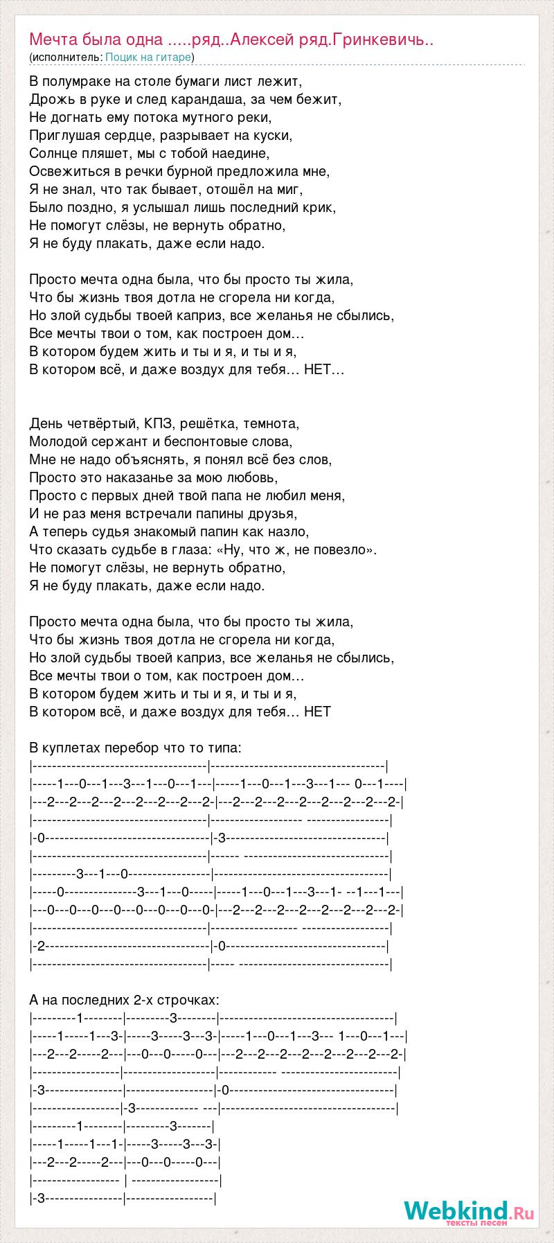 В полумраке на столе бумаги лист лежит, Дрожь в руке и след карандаша, за чем бежит, Не догнать ему потока мутного реки, Приглушая сердце, разрывает на куски, Солнце пляшет, мы с тобой наедине, Освежиться в речки бурной предложила мне, Я не знал, что так бывает, отошёл на миг, Было поздно, я услышал лишь последний крик, Не помогут слёзы, не вернуть обратно, Я не буду плакать, даже если надо. Просто мечта одна была, что бы просто ты жила, Что бы жизнь твоя дотла не сгорела ни когда, Но злой судьбы твоей каприз, все желанья не сбылись, Все мечты твои о том, как построен дом… В котором будем жить и ты и я, и ты и я, В котором всё, и даже воздух для тебя… НЕТ… День четвёртый, КПЗ, решётка, темнота, Молодой сержант и беспонтовые слова, Мне не надо объяснять, я понял всё без слов, Просто это наказанье за мою любовь, Просто с первых дней твой папа не любил меня, И не раз меня встречали папины друзья, А теперь судья знакомый папин как назло, Что сказать судьбе в глаза: «Ну, что ж, не повезло». Не помогут слёзы, не вернуть обратно, Я не буду плакать, даже если надо. Просто мечта одна была, что бы просто ты жила, Что бы жизнь твоя дотла не сгорела ни когда, Но злой судьбы твоей каприз, все желанья не сбылись, Все мечты твои о том, как построен дом… В котором будем жить и ты и я, и ты и я, В котором всё, и даже воздух для тебя… НЕТ В куплетах перебор что то типа: |------------------------------------|------------------------------------| |-----1---0---1---3---1---0---1---|-----1---0---1---3---1--- 0---1----| |---2---2---2---2---2---2---2---2-|---2---2---2---2---2---2---2---2-| |------------------------------------|------------------- -----------------| |-0----------------------------------|-3---------------------------------| |------------------------------------|------ ------------------------------| |---------3---1---0-----------------|------------------------------------| |-----0---------------3---1---0-----|-----1---0---1---3---1- --1---1---| |---0---0---0---0---0---0---0---0-|---2---2---2---2---2---2---2---2-| |------------------------------------|------------------ ------------------| |-2----------------------------------|-0---------------------------------| |------------------------------------|----- -------------------------------| А на последних 2-х строчках: |---------1--------|---------3--------|------------------------------------| |-----1-----1---3-|-----3-----3---3-|-----1---0---1---3--- 1---0---1---| |---2---2-----2---|---0---0-----0---|---2---2---2---2---2---2---2---2-| |------------------|-------------------|------------ ------------------------| |-3----------------|------------------|-0----------------------------------| |------------------|-3------------- ---|------------------------------------| |---------1--------|---------3-------| |-----1-----1---1-|-----3-----3---3-| |---2---2-----2---|---0---0-----0---| |------------------ | ------------------| |-3----------------|------------------|