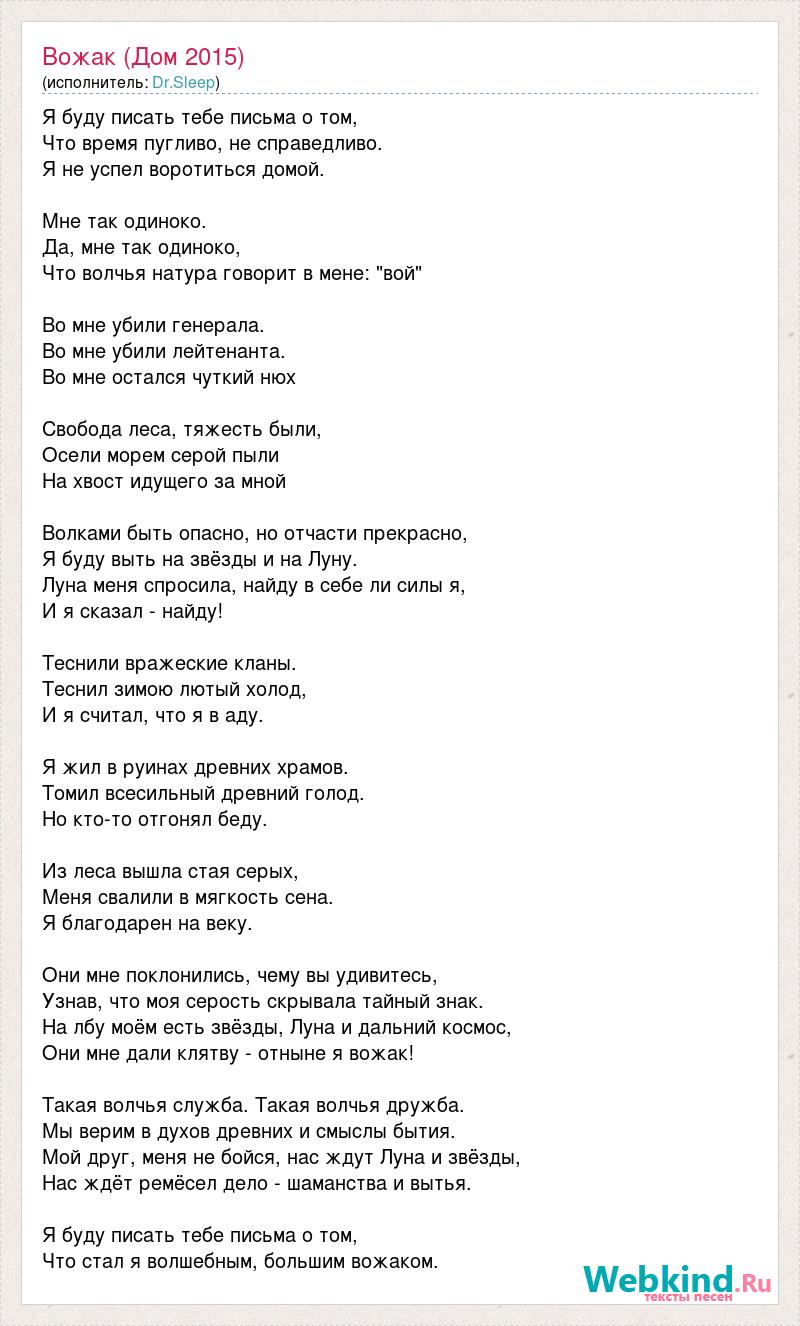 Я буду писать тебе письма о том, Что время пугливо, не справедливо. Я не успел воротиться домой. Мне так одиноко. Да, мне так одиноко, Что волчья натура говорит в мене: "вой" Во мне убили генерала. Во мне убили лейтенанта. Во мне остался чуткий нюх Свобода леса, тяжесть были, Осели морем серой пыли На хвост идущего за мной Волками быть опасно, но отчасти прекрасно, Я буду выть на звёзды и на Луну. Луна меня спросила, найду в себе ли силы я, И я сказал - найду! Теснили вражеские кланы. Теснил зимою лютый холод, И я считал, что я в аду. Я жил в руинах древних храмов. Томил всесильный древний голод. Но кто-то отгонял беду. Из леса вышла стая серых, Меня свалили в мягкость сена. Я благодарен на веку. Они мне поклонились, чему вы удивитесь, Узнав, что моя серость скрывала тайный знак. На лбу моём есть звёзды, Луна и дальний космос, Они мне дали клятву - отныне я вожак! Такая волчья служба. Такая волчья дружба. Мы верим в духов древних и смыслы бытия. Мой друг, меня не бойся, нас ждут Луна и звёзды, Нас ждёт ремёсел дело - шаманства и вытья. Я буду писать тебе письма о том, Что стал я волшебным, большим вожаком.