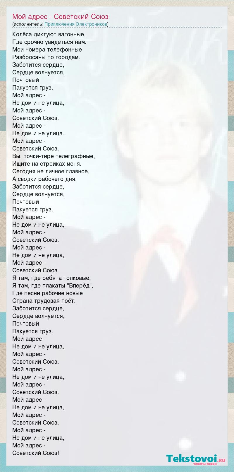 Колёса диктуют вагонные, Где срочно увидеться нам. Мои номера телефонные Разбросаны по городам. Заботится сердце, Сердце волнуется, Почтовый Пакуется груз. Мой адрес - Не дом и не улица, Мой адрес - Советский Союз. Мой адрес - Не дом и не улица. Мой адрес - Советский Союз. Вы, точки-тире телеграфные, Ищите на стройках меня. Сегодня не личное главное, А сводки рабочего дня. Заботится сердце, Сердце волнуется, Почтовый Пакуется груз. Мой адрес - Не дом и не улица, Мой адрес - Советский Союз. Мой адрес - Не дом и не улица, Мой адрес - Советский Союз. Я там, где ребята толковые, Я там, где плакаты "Вперёд", Где песни рабочие новые Страна трудовая поёт. Заботится сердце, Сердце волнуется, Почтовый Пакуется груз. Мой адрес - Не дом и не улица, Мой адрес - Советский Союз. Мой адрес - Не дом и не улица, Мой адрес - Советский Союз. Мой адрес - Не дом и не улица, Мой адрес - Советский Союз. Мой адрес - Не дом и не улица, Мой адрес - Советский Союз!