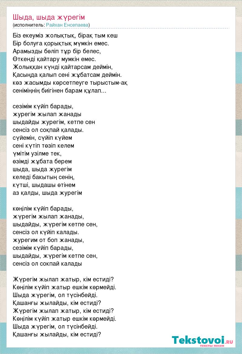 Біз екеуміз жолықтық, бірақ тым кеш Бір болуға қорықтық мүмкін емес. Арамызды бөліп тұр бір белес, Өткенді қайтару мумкін емес. Жолыққан күнді қайтарсам деймін, Қасыңда қалып сені жұбатсам деймін. көз жасымды көрсетпеуге тырыстым-ақ сеніміңнің биігінен барам құлап... сезімім күйіп барады, журегім жылап жанады шыдайды журегім, кетпе сен сенсіз ол соқпай қалады. сүйемін, сүйіп күйем сені күтіп төзіп келем үмітім узілме тек, өзімді жұбата берем шыда, шыда журегім келеді бакытың сенің, күтші, шыдашы өтінем аз қалды, шыда журегім көңілім күйіп барады, жүрегім жылап жанады, шыдайды, жүрегім кетпе сен, сенсіз ол күйіп калады. журегим от боп жанады, сезімім күйіп барады, шыдайды, жүрегім кетпе сен, сенсіз ол сокпай калады Жүрегім жылап жатыр, кім естиді? Көңілім күйіп жатыр ешкім көрмейді. Шыда жүрегім, ол түсінбейді. Қашанғы жылайды, кім естиді? Жүрегім жылап жатыр, кім естиді? Көңілім күйіп жатыр ешкім көрмейді. Шыда жүрегім, ол түсінбейді. Қашанғы жылайды, кім естиді?