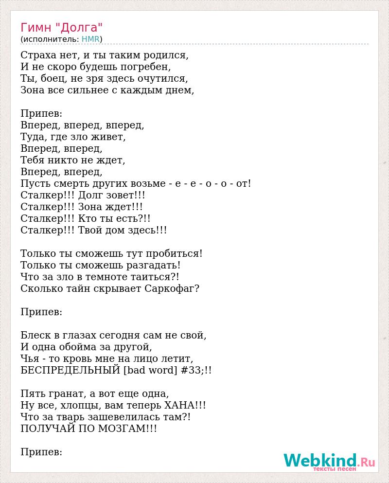 Страха нет, и ты таким родился, И не скоро будешь погребен, Ты, боец, не зря здесь очутился, Зона все сильнее с каждым днем, Припев: Вперед, вперед, вперед, Туда, где зло живет, Вперед, вперед, Тебя никто не ждет, Вперед, вперед, Пусть смерть других возьме - е - е - о - о - от! Сталкер!!! Долг зовет!!! Сталкер!!! Зона ждет!!! Сталкер!!! Кто ты есть?!! Сталкер!!! Твой дом здесь!!! Только ты сможешь тут пробиться! Только ты сможешь разгадать! Что за зло в темноте таиться?! Сколько тайн скрывает Саркофаг? Припев: Блеск в глазах сегодня сам не свой, И одна обойма за другой, Чья - то кровь мне на лицо летит, БЕСПРЕДЕЛЬНЫЙ [bad word] #33;!! Пять гранат, а вот еще одна, Ну все, хлопцы, вам теперь ХАНА!!! Что за тварь зашевелилась там?! ПОЛУЧАЙ ПО МОЗГАМ!!! Припев: