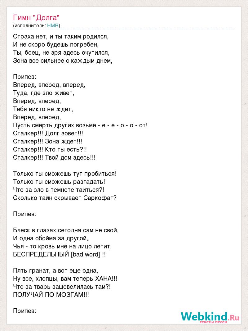 Страха нет, и ты таким родился, И не скоро будешь погребен, Ты, боец, не зря здесь очутился, Зона все сильнее с каждым днем, Припев: Вперед, вперед, вперед, Туда, где зло живет, Вперед, вперед, Тебя никто не ждет, Вперед, вперед, Пусть смерть других возьме - е - е - о - о - от! Сталкер!!! Долг зовет!!! Сталкер!!! Зона ждет!!! Сталкер!!! Кто ты есть?!! Сталкер!!! Твой дом здесь!!! Только ты сможешь тут пробиться! Только ты сможешь разгадать! Что за зло в темноте таиться?! Сколько тайн скрывает Саркофаг? Припев: Блеск в глазах сегодня сам не свой, И одна обойма за другой, Чья - то кровь мне на лицо летит, БЕСПРЕДЕЛЬНЫЙ [bad word] !! Пять гранат, а вот еще одна, Ну все, хлопцы, вам теперь ХАНА!!! Что за тварь зашевелилась там?! ПОЛУЧАЙ ПО МОЗГАМ!!! Припев:
