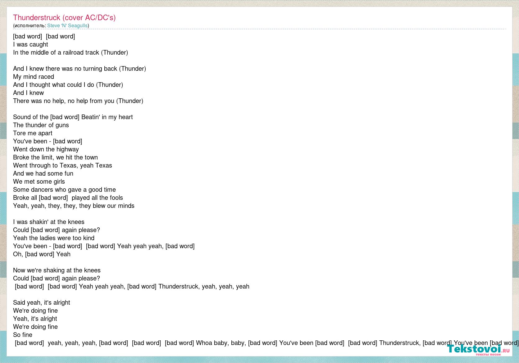 [bad word] [bad word] I was caught In the middle of a railroad track (Thunder) And I knew there was no turning back (Thunder) My mind raced And I thought what could I do (Thunder) And I knew There was no help, no help from you (Thunder) Sound of the drums Beatin' in my heart The thunder of guns Tore me apart You've been - thunderstruck Went down the highway Broke the limit, we hit the town Went through to Texas, yeah Texas And we had some fun We met some girls Some dancers who gave a good time Broke all the rules, played all the fools Yeah, yeah, they, they, they blew our minds I was shakin' at the knees Could I come again please? Yeah the ladies were too kind You've been - thunderstruck, thunderstruck Yeah yeah yeah, thunderstruck Oh, thunderstruck Yeah Now we're shaking at the knees Could I come again please? Thunderstruck, thunderstruck Yeah yeah yeah, thunderstruck Thunderstruck, yeah, yeah, yeah Said yeah, it's alright We're doing fine Yeah, it's alright We're doing fine So fine Thunderstruck, yeah, yeah, yeah, Tunderstruck, thunderstruck, thunderstruck Whoa baby, baby, thunderstruck You've been thunderstruck, thunderstruck Thunderstruck, thunderstruck You've been thunderstruck