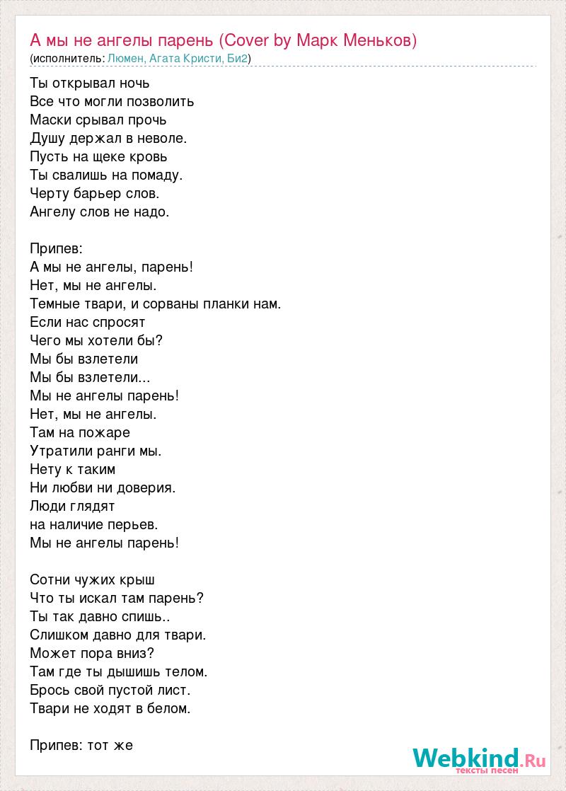 Ты открывал ночь Все что могли позволить Маски срывал прочь Душу держал в неволе. Пусть на щеке кровь Ты свалишь на помаду. Черту барьер слов. Ангелу слов не надо. Припев: А мы не ангелы, парень! Нет, мы не ангелы. Темные твари, и сорваны планки нам. Если нас спросят Чего мы хотели бы? Мы бы взлетели Мы бы взлетели... Мы не ангелы парень! Нет, мы не ангелы. Там на пожаре Утратили ранги мы. Нету к таким Ни любви ни доверия. Люди глядят на наличие перьев. Мы не ангелы парень! Сотни чужих крыш Что ты искал там парень? Ты так давно спишь.. Слишком давно для твари. Может пора вниз? Там где ты дышишь телом. Брось свой пустой лист. Твари не ходят в белом. Припев: тот же