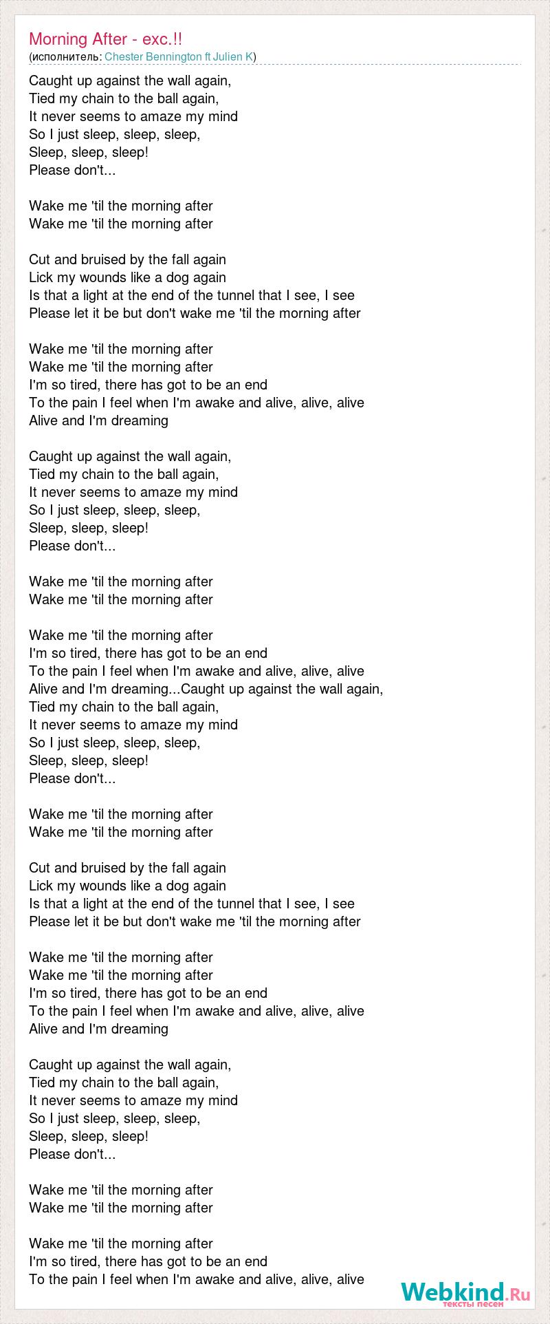 Caught up against the wall again, Tied my chain to the ball again, It never seems to amaze my mind So I just sleep, sleep, sleep, Sleep, sleep, sleep! Please don't... Wake me 'til the morning after Wake me 'til the morning after Cut and bruised by the fall again Lick my wounds like a dog again Is that a light at the end of the tunnel that I see, I see Please let it be but don't wake me 'til the morning after Wake me 'til the morning after Wake me 'til the morning after I'm so tired, there has got to be an end To the pain I feel when I'm awake and alive, alive, alive Alive and I'm dreaming Caught up against the wall again, Tied my chain to the ball again, It never seems to amaze my mind So I just sleep, sleep, sleep, Sleep, sleep, sleep! Please don't... Wake me 'til the morning after Wake me 'til the morning after Wake me 'til the morning after I'm so tired, there has got to be an end To the pain I feel when I'm awake and alive, alive, alive Alive and I'm dreaming...Caught up against the wall again, Tied my chain to the ball again, It never seems to amaze my mind So I just sleep, sleep, sleep, Sleep, sleep, sleep! Please don't... Wake me 'til the morning after Wake me 'til the morning after Cut and bruised by the fall again Lick my wounds like a dog again Is that a light at the end of the tunnel that I see, I see Please let it be but don't wake me 'til the morning after Wake me 'til the morning after Wake me 'til the morning after I'm so tired, there has got to be an end To the pain I feel when I'm awake and alive, alive, alive Alive and I'm dreaming Caught up against the wall again, Tied my chain to the ball again, It never seems to amaze my mind So I just sleep, sleep, sleep, Sleep, sleep, sleep! Please don't... Wake me 'til the morning after Wake me 'til the morning after Wake me 'til the morning after I'm so tired, there has got to be an end To the pain I feel when I'm awake and alive, alive, alive