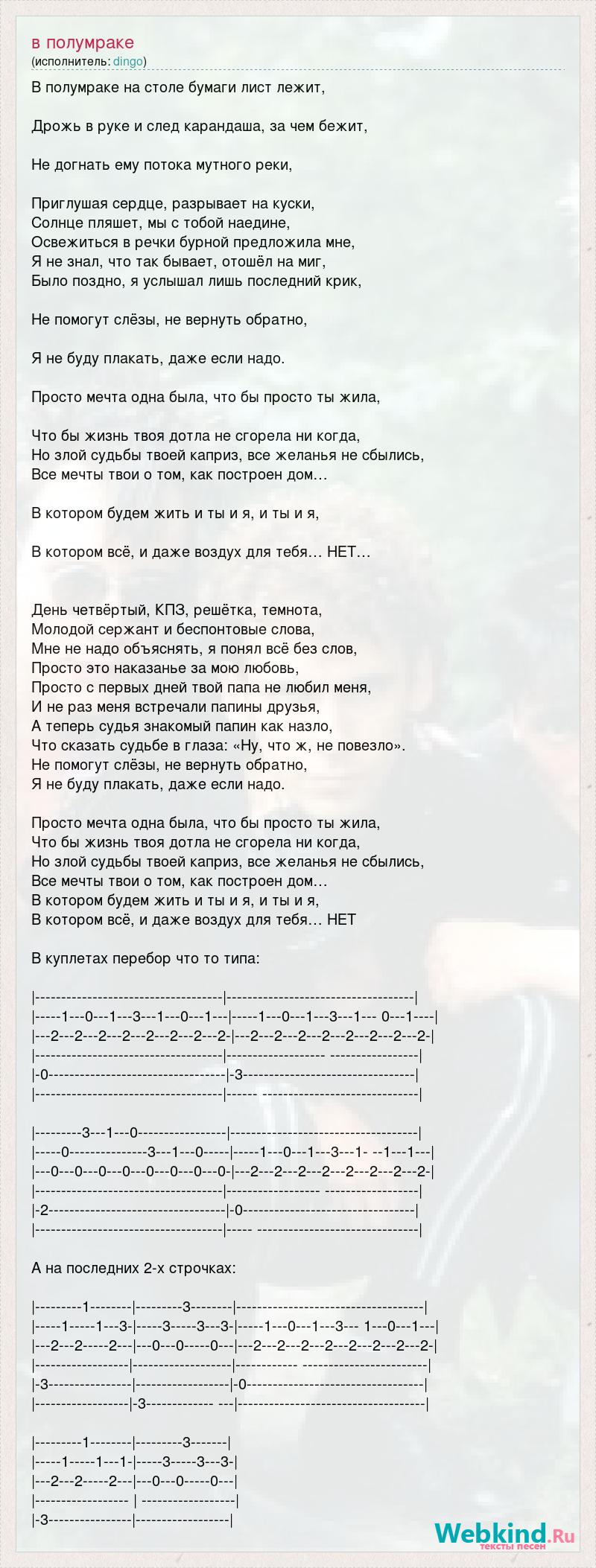 В полумраке на столе бумаги лист лежит, Дрожь в руке и след карандаша, за чем бежит, Не догнать ему потока мутного реки, Приглушая сердце, разрывает на куски, Солнце пляшет, мы с тобой наедине, Освежиться в речки бурной предложила мне, Я не знал, что так бывает, отошёл на миг, Было поздно, я услышал лишь последний крик, Не помогут слёзы, не вернуть обратно, Я не буду плакать, даже если надо. Просто мечта одна была, что бы просто ты жила, Что бы жизнь твоя дотла не сгорела ни когда, Но злой судьбы твоей каприз, все желанья не сбылись, Все мечты твои о том, как построен дом… В котором будем жить и ты и я, и ты и я, В котором всё, и даже воздух для тебя… НЕТ… День четвёртый, КПЗ, решётка, темнота, Молодой сержант и беспонтовые слова, Мне не надо объяснять, я понял всё без слов, Просто это наказанье за мою любовь, Просто с первых дней твой папа не любил меня, И не раз меня встречали папины друзья, А теперь судья знакомый папин как назло, Что сказать судьбе в глаза: «Ну, что ж, не повезло». Не помогут слёзы, не вернуть обратно, Я не буду плакать, даже если надо. Просто мечта одна была, что бы просто ты жила, Что бы жизнь твоя дотла не сгорела ни когда, Но злой судьбы твоей каприз, все желанья не сбылись, Все мечты твои о том, как построен дом… В котором будем жить и ты и я, и ты и я, В котором всё, и даже воздух для тебя… НЕТ В куплетах перебор что то типа: |------------------------------------|------------------------------------| |-----1---0---1---3---1---0---1---|-----1---0---1---3---1--- 0---1----| |---2---2---2---2---2---2---2---2-|---2---2---2---2---2---2---2---2-| |------------------------------------|------------------- -----------------| |-0----------------------------------|-3---------------------------------| |------------------------------------|------ ------------------------------| |---------3---1---0-----------------|------------------------------------| |-----0---------------3---1---0-----|-----1---0---1---3---1- --1---1---| |---0---0---0---0---0---0---0---0-|---2---2---2---2---2---2---2---2-| |------------------------------------|------------------ ------------------| |-2----------------------------------|-0---------------------------------| |------------------------------------|----- -------------------------------| А на последних 2-х строчках: |---------1--------|---------3--------|------------------------------------| |-----1-----1---3-|-----3-----3---3-|-----1---0---1---3--- 1---0---1---| |---2---2-----2---|---0---0-----0---|---2---2---2---2---2---2---2---2-| |------------------|-------------------|------------ ------------------------| |-3----------------|------------------|-0----------------------------------| |------------------|-3------------- ---|------------------------------------| |---------1--------|---------3-------| |-----1-----1---1-|-----3-----3---3-| |---2---2-----2---|---0---0-----0---| |------------------ | ------------------| |-3----------------|------------------|