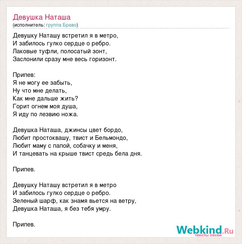 Девушку Наташу встретил я в метро, И забилось гулко сердце о ребро. Лаковые туфли, полосатый зонт, Заслонили сразу мне весь горизонт. Припев: Я не могу ее забыть, Ну что мне делать, Как мне дальше жить? Горит огнем моя душа, Я иду по лезвию ножа. Девушка Наташа, джинсы цвет бордо, Любит простоквашу, твист и Бельмондо, Любит маму с папой, собачку и меня, И танцевать на крыше твист средь бела дня. Припев. Девушку Наташу встретил я в метро И забилось гулко сердце о ребро. Зеленый шарф, как знамя вьется на ветру, Девушка Наташа, я без тебя умру. Припев.