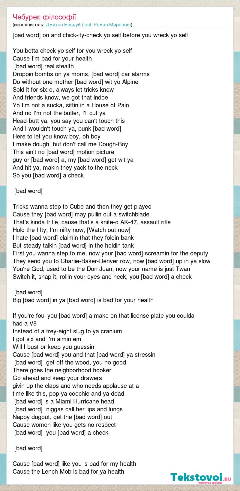 So come on and chick-ity-check yo self before you wreck yo self You betta check yo self for you wreck yo self Cause I'm bad for your health I come real stealth Droppin bombs on ya moms, [bad word] car alarms Do without one mother [bad word] wit yo Alpine Sold it for six-o, always let tricks know And friends know, we got that indoe Yo I'm not a sucka, sittin in a House of Pain And no I'm not the butler, I'll cut ya Head-butt ya, you say you can't touch this And I wouldn't touch ya, punk [bad word] Here to let you know boy, oh boy I make dough, but don't call me Dough-Boy This ain't no [bad word] motion picture guy or [bad word] a, my [bad word] get wit ya And hit ya, makin they yack to the neck So you better run a check CHORUS Tricks wanna step to Cube and then they get played Cause they [bad word] may pullin out a switchblade That's kinda trifle, cause that's a knife-o AK-47, assault rifle Hold the fifty, I'm nifty now, [Watch out now] I hate [bad word] claimin that they foldin bank But steady talkin [bad word] in the holdin tank First you wanna step to me, now your [bad word] screamin for the deputy They send you to Charlie-Baker-Denver row, now the runnin up in ya slow You're God, used to be the Don Juan, now your name is just Twan Switch it, snap it, rollin your eyes and neck, you better run a check CHORUS Big [bad word] in ya [bad word] is bad for your health If you're foul you better run a make on that license plate you coulda had a V8 Instead of a trey-eight slug to ya cranium I got six and I'm aimin em Will I bust or keep you guessin Cause [bad word] you and that [bad word] ya stressin [bad word] get off the wood, you no good There goes the neighborhood hooker Go ahead and keep your drawers givin up the claps and who needs applause at a time like this, pop ya coochie and ya dead [bad word] is a Miami Hurricane head Sprung, niggas call her lips and lungs Nappy dugout, get the [bad word] out Cause women like you gets no respect [bad word] you better run a check CHORUS Cause [bad word] like you is bad for my health Cause the Lench Mob is bad for ya health
